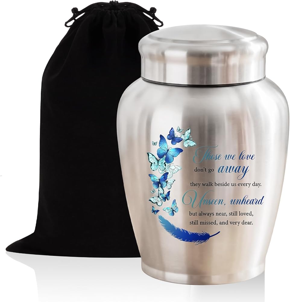 جرة حرق الجثث: مصنوعة من الفولاذ المقاوم للصدأ الفاخر، جرة الدفن الخاصة برماد الإنسان البالغ صلبة؛ متينة، وجرار الرماد البشري لن تصدأ؛ لا تشوه. يتم إنشاء صورة ريشة الفراشة الموجودة على جرار حرق الجثث للرماد البشري باستخدام عملية طباعة رقمية ملونة تضمن عدم بهتان الألوان الزاهية. جرة كبيرة أنيقة وجميلة تستحق حبيبك