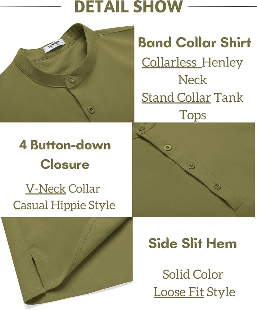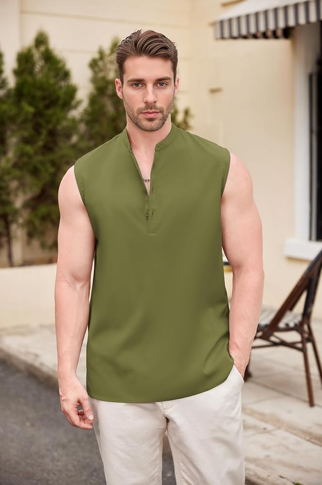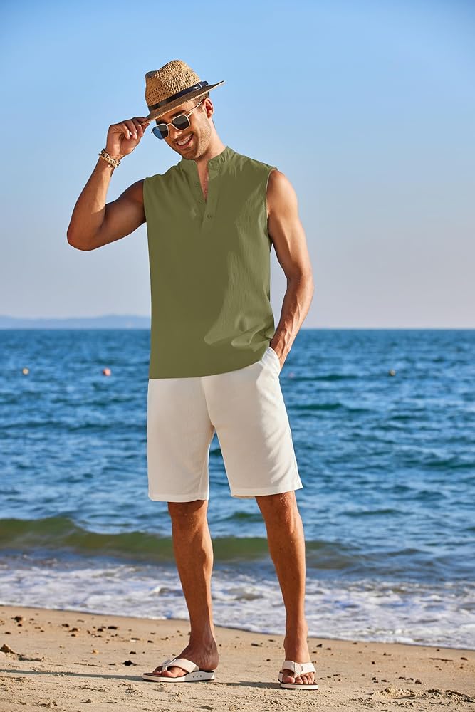 COOFANDY Mens Sleeveless Beach Shirts Casual Tank Tops Summer Button up Henley ShirtsProduct Feature: Sleeveless henley shirts for men, made of soft and comfortable fabric, feature with skin friendly, lightweight, breathable, wrinkle free and no need to iron, which can provide you comfort all the time. Brand: COOFANDY provide casual menswear and best customer experience. Providing Premium Quality, Great fabric for everyday outlook, Stylish design. Main Features:Color:Black, White, Navy Blue, Light Blue, Light Brown, Light GreySeason: Spring,Summer,FallDesign: Men tank top, band collar, solid color, button-down closure, Sleeveless. The sleeveless design allows air to circulate, preventing overheating and ensuring maximum comfort.Fit Style:RegularOccasions:This beach tank top is perfectly suitable for various occasions like beach, wedding, party, vacation, travel, cruises, camping, birthday, festival, lounging, yoga, meditation or daily casual wear. Also, it will be a good gift for your father, brother, boyfriend, husband, son or other male friends.Garment Care: Machine and hand wash are both available for the sleeveless hippie shirts. We recommend to buy one size bigger for loose, comfortable fit.