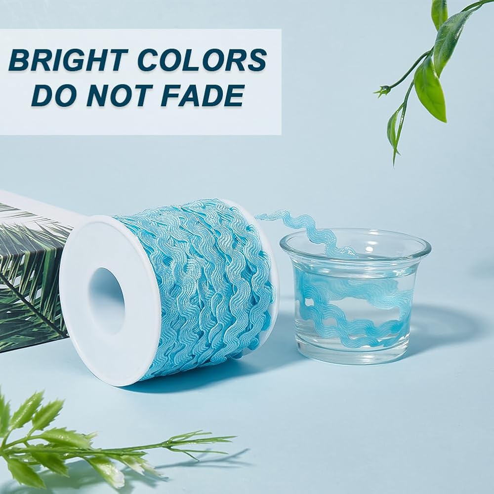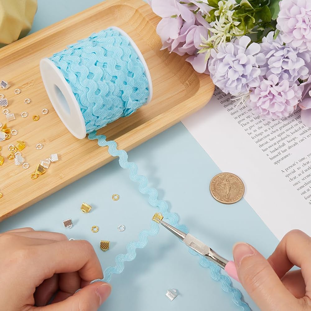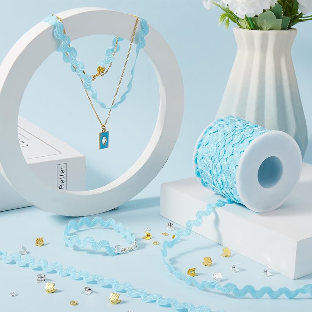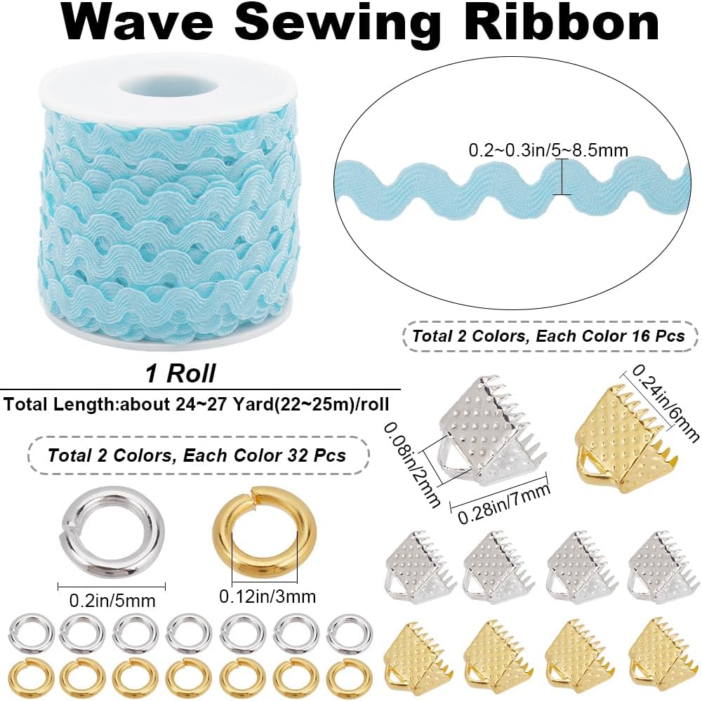 GORGECRAFT 27 Yards Blue Rick Rack Trim Ribbon 1/4 inch~3/8 inch Wave Sewing Bending Fringe Trim with 32Pcs 2 Colors Iron Ribbon Crimp Ends and 64Pcs 2 Colors Jump Rings for DIY Sewing Crafts Clothes