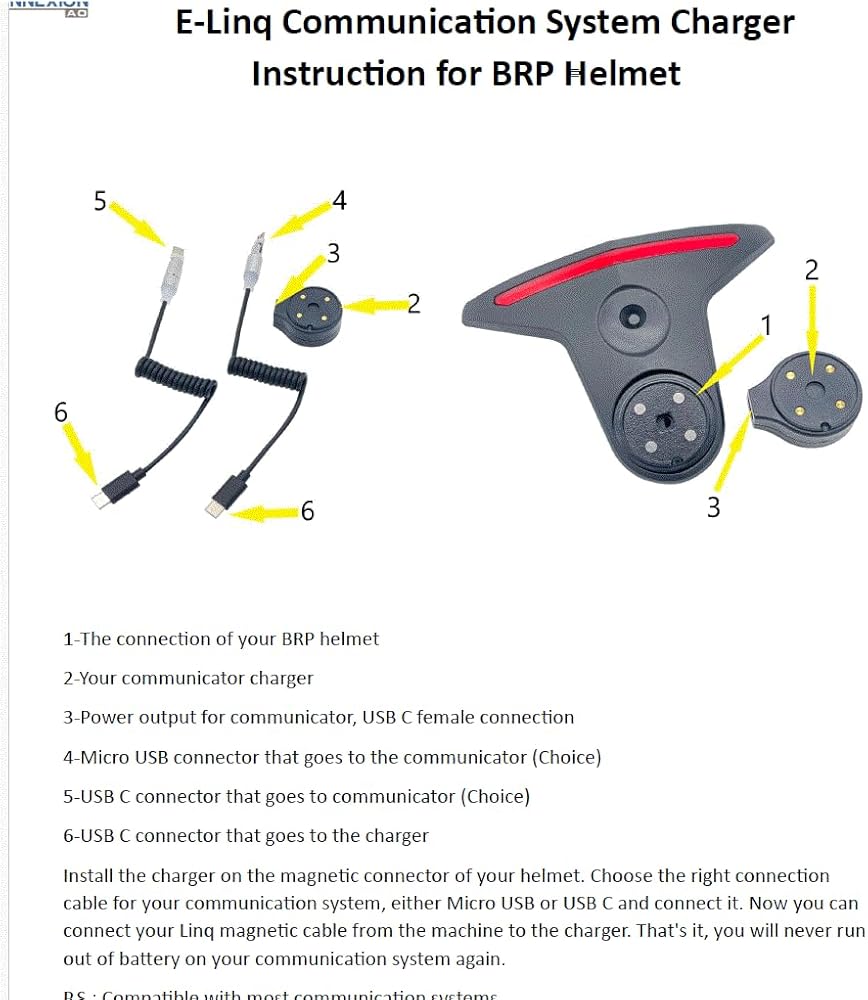 Charger for communication system compatible for BRP helmets that have an E-Linq connection. Compatible with most communicator, Cardo, Sena, etc. Not compatible with communicators that use the same port for charging as for headphones. The charger is installed between the E-Ling connection and the magnetic connector of the helmet. Accuracy: When powering your communications system, make sure your heat control is at maximum, then you can adjust your level.