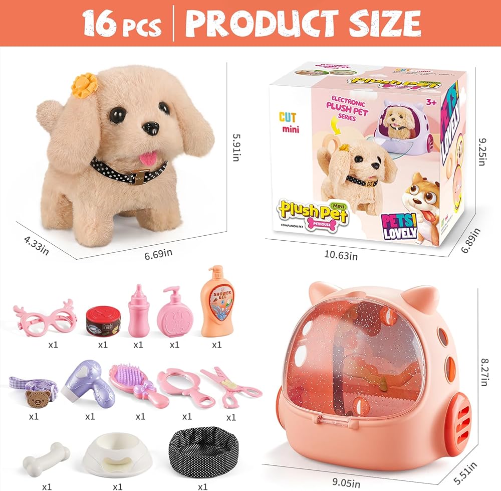 • 16 قطعة من ألعاب الكلاب للأطفال - ألعاب الكلاب الخاصة بنا للأطفال غنية بـ 16 قطعة من ألعاب الحيوانات الأليفة التظاهرية. كلب جولدن ريتريفر لطيف محشو يمشي ويتناغم مع فتياتك الصغيرات، مع وعاء الكلب والزجاجة والعظام والطعام المعلب، قم بإطعامه من فضلك. احصل على مقود الكلب وضع لعبة الكلب للأطفال هذه في حاملة الكلاب للاستمتاع بالمرح في الهواء الطلق. بمجرد عودتك، تظاهر باستخدام الشامبو والمشط ومجفف الشعر والمقص والمرآة والنظارات والمشبك للاستحمام والعناية بالجرو القطيفة اللطيف. بالإضافة إلى ذلك، يوجد سرير للكلاب ليستريح عليه