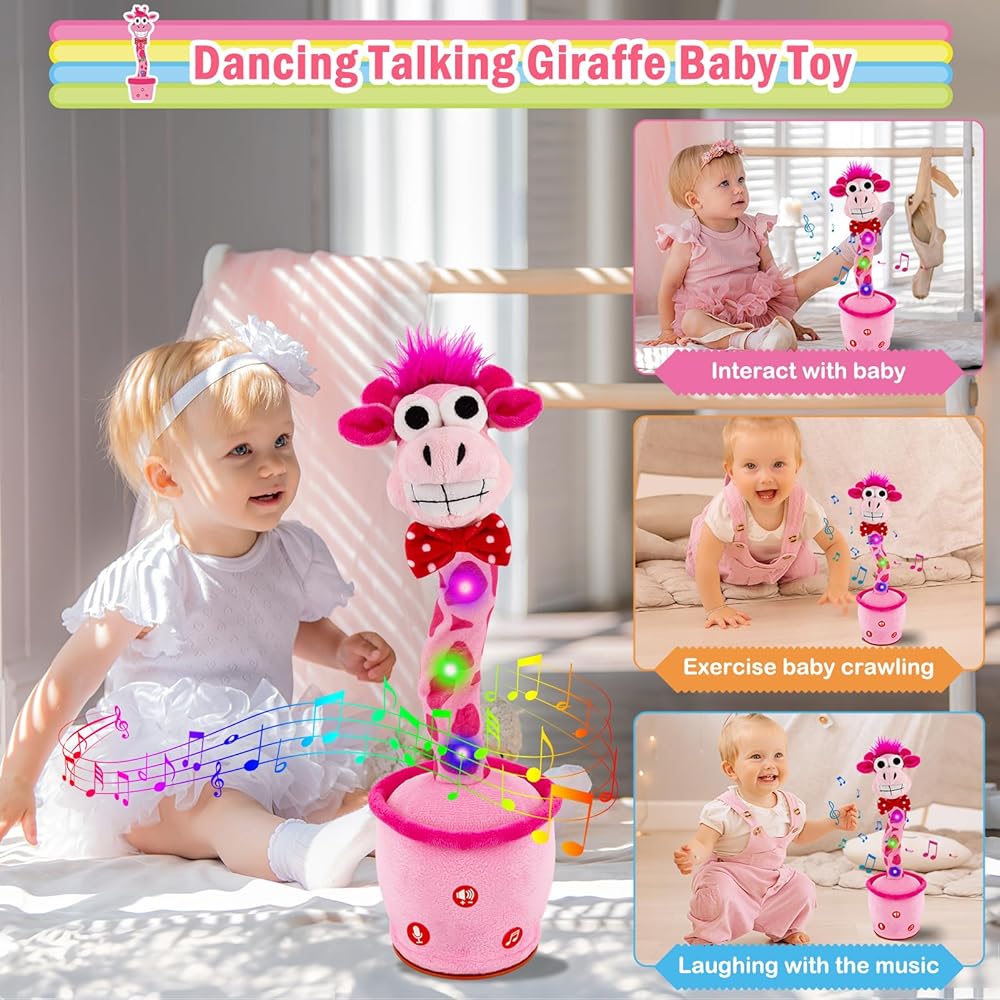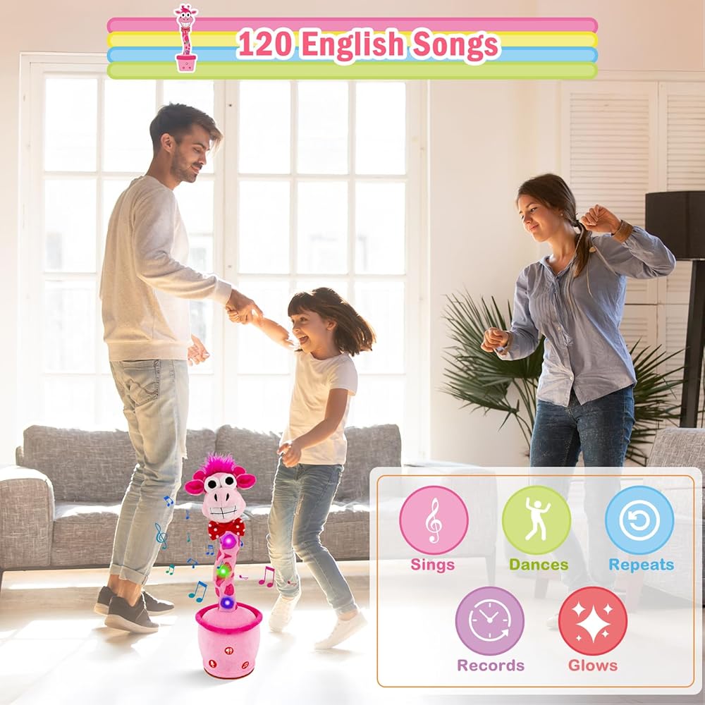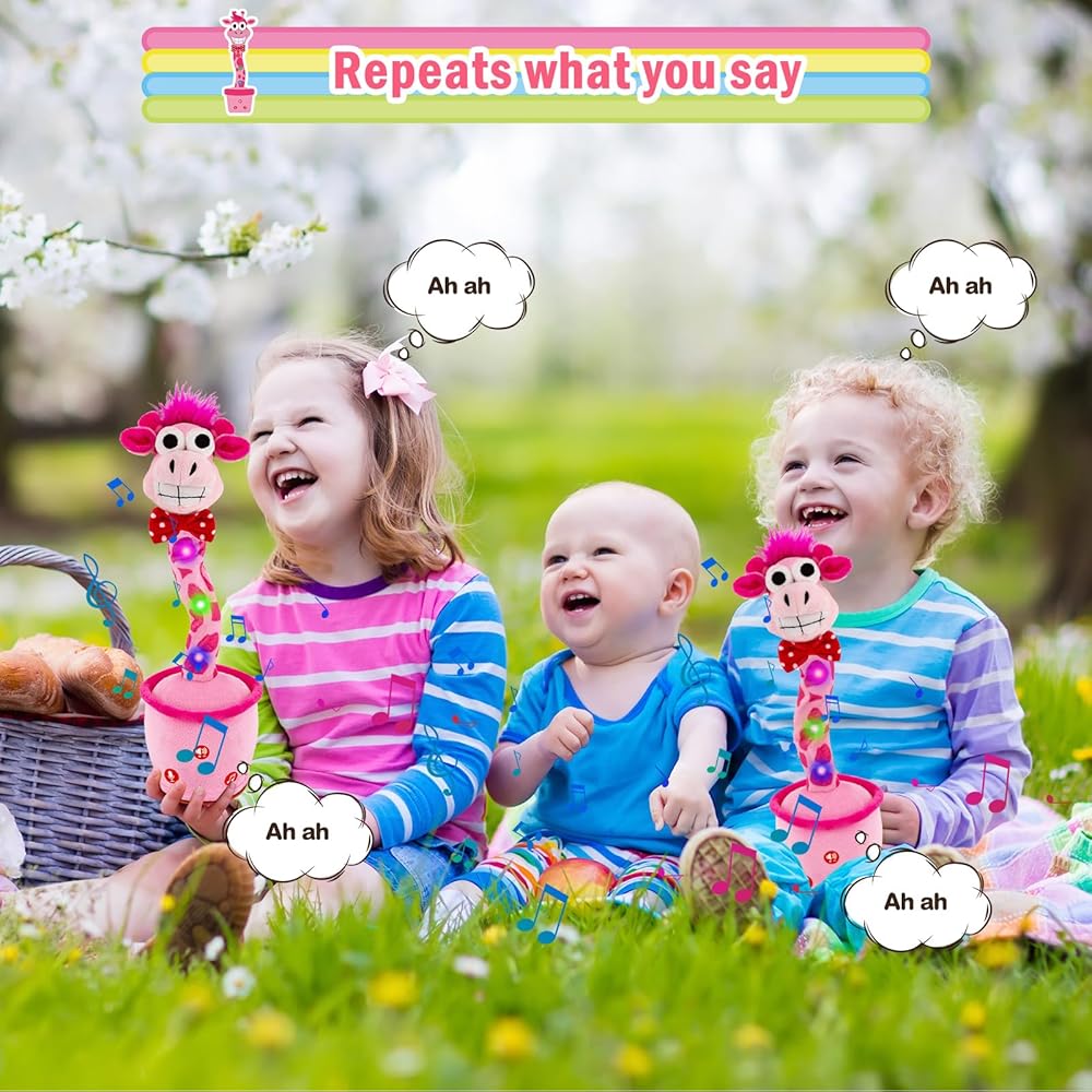 الزرافة التي تكرر ما تقوله: هذه الزرافة الناطقة الراقصة تكرر أي شيء تقوله. إنه يضحك عندما تضحك ويصرخ عندما تصرخ. يمكنه تسجيل وحفظ رسالة صوتية واحدة لتشغيلها بشكل متكرر. تساعد ميزة المحاكاة هذه الأطفال على تعلم نطق الكلمات والتعبير عن أفكارهم، وهي مثالية للأطفال المصابين بالتوحد أو تأخر الكلام.