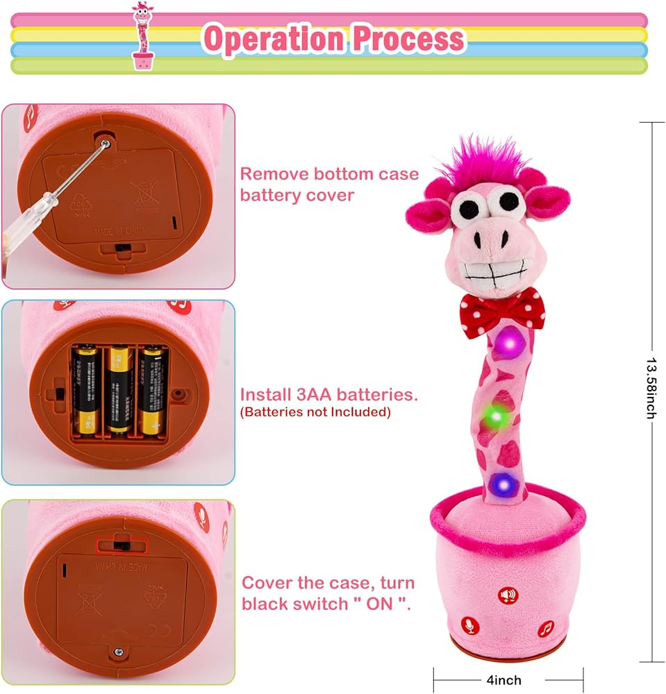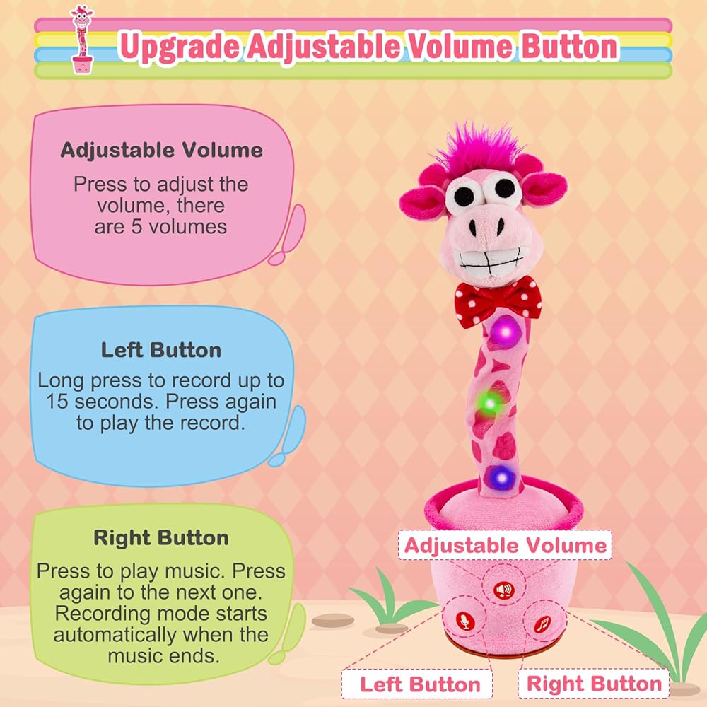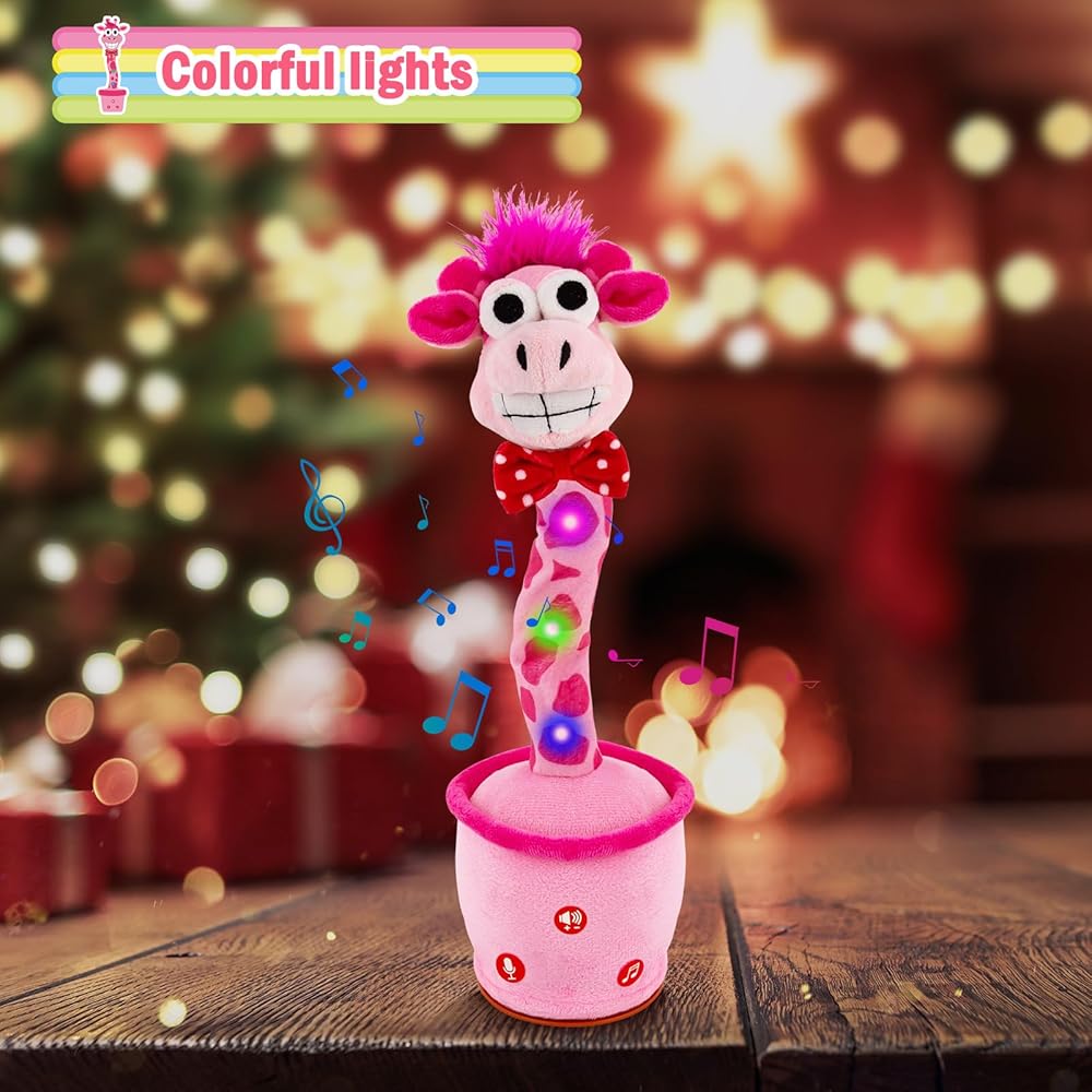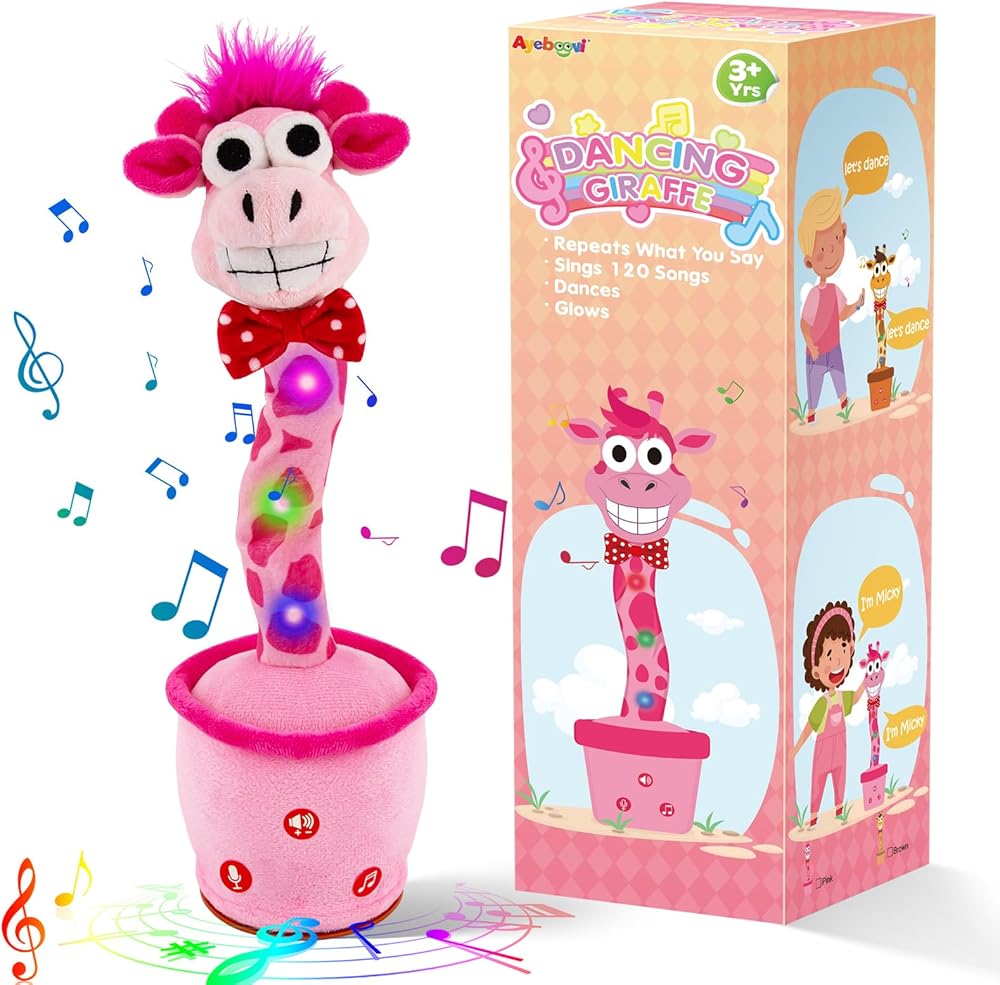 الزرافة التي تكرر ما تقوله: هذه الزرافة الناطقة الراقصة تكرر أي شيء تقوله. إنه يضحك عندما تضحك ويصرخ عندما تصرخ. يمكنه تسجيل وحفظ رسالة صوتية واحدة لتشغيلها بشكل متكرر. تساعد ميزة المحاكاة هذه الأطفال على تعلم نطق الكلمات والتعبير عن أفكارهم، وهي مثالية للأطفال المصابين بالتوحد أو تأخر الكلام.