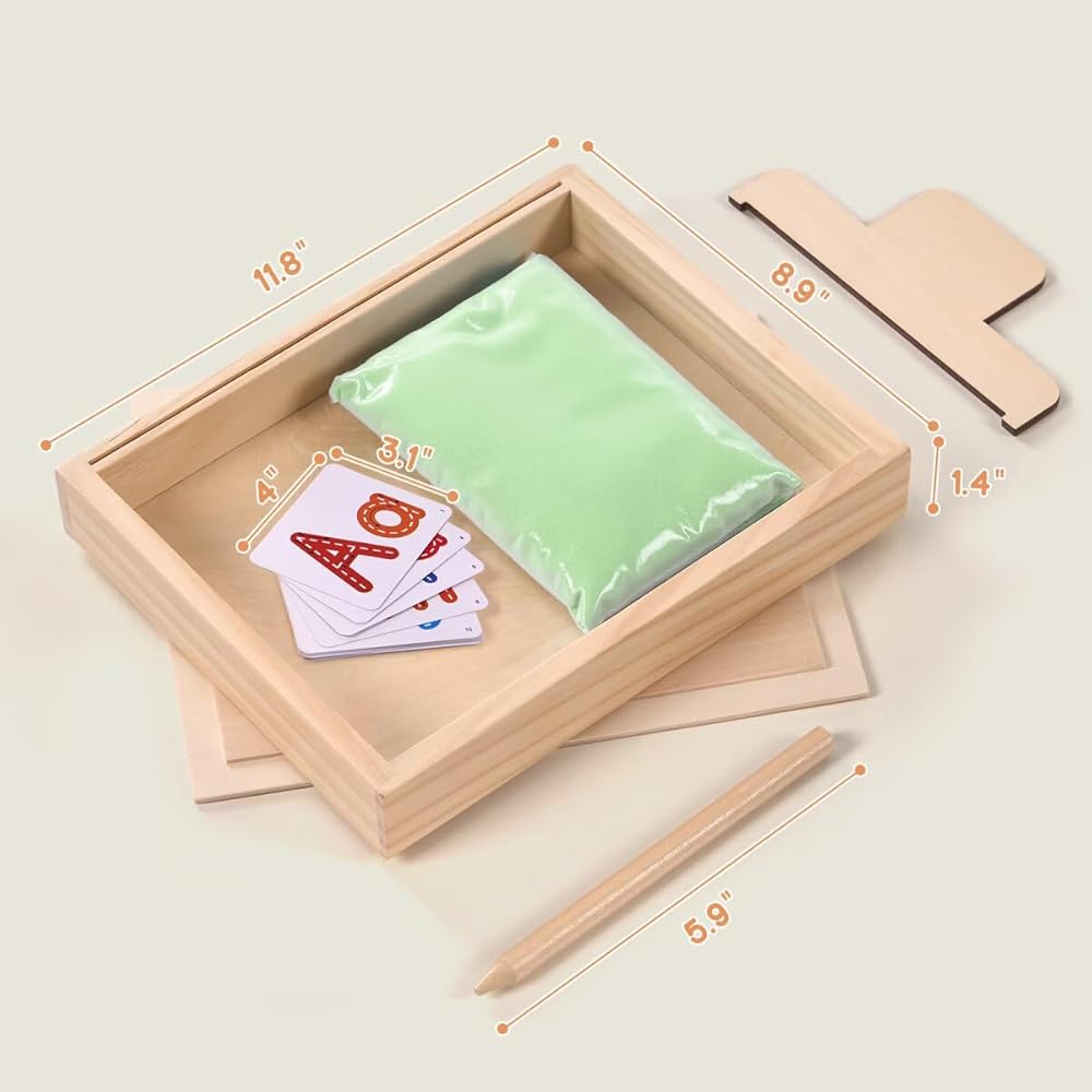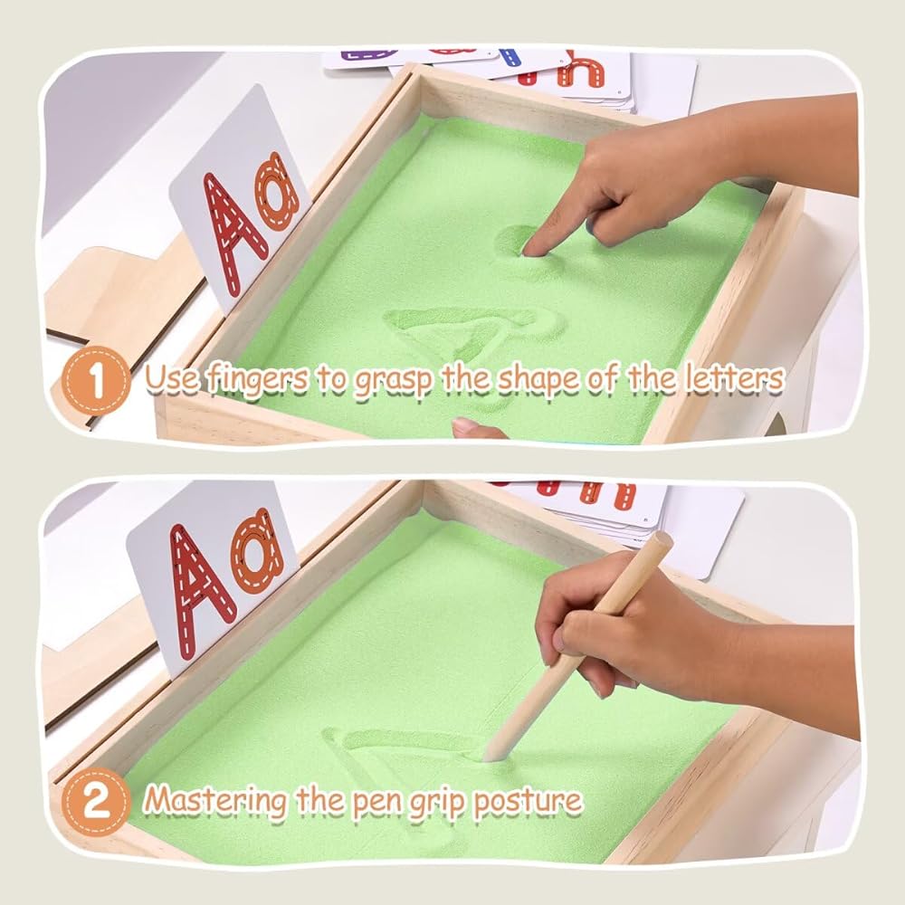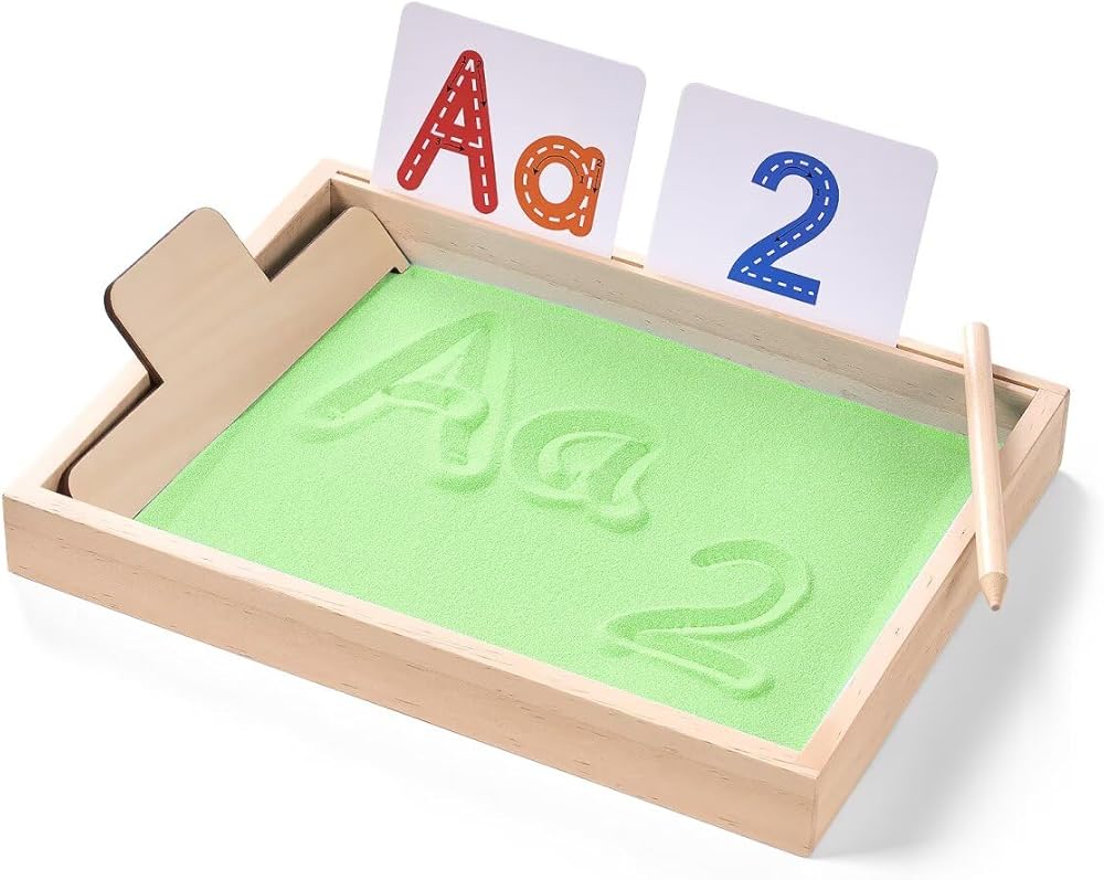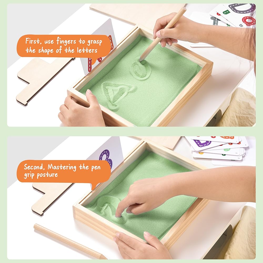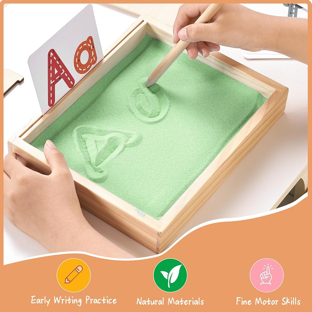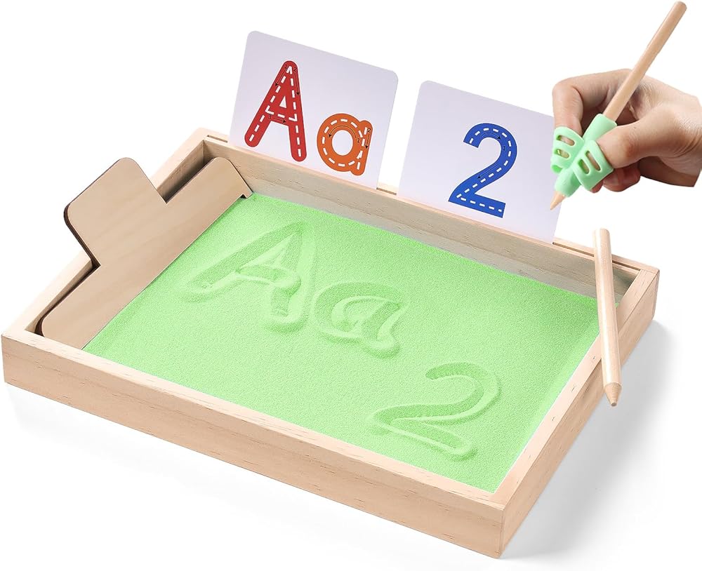 ممارسة الكتابة المبكرة - يمكن للطفل تحريك الرمل بأصابعه أثناء ممارسة حروفه، مما يوفر ممارسة الكتابة اليدوية باللمس، على عكس أقلام الرصاص العادية، هناك طريقة لمسية وممتعة غنية للكتابة على الرمل، وتستخدم لتدريب عضلات اليد وتشكيل الذكريات حتى يتقنون بنية الحروف الصحيحة