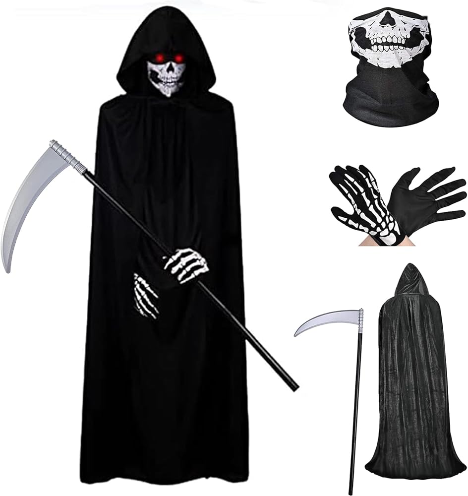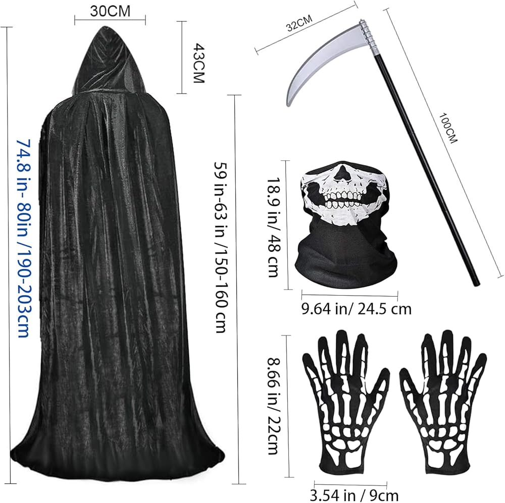 【تصميم مجموعة الجمجمة】--تتضمن أزياء الهالوين المخيفة زيًا واحدًا لحصاد الأرواح، وزوجًا واحدًا من قفازات الجمجمة، ودعامة منجلية واحدة، وقناع جمجمة واحد. في الهالوين أو الحفلات التنكرية، ترتدي العباءة ذات القلنسوة، أنت الوجود الأروع والأكثر غموضًا في الظلام!
