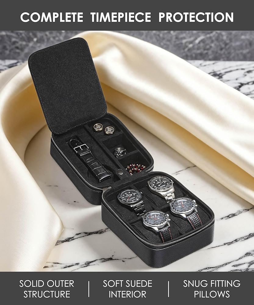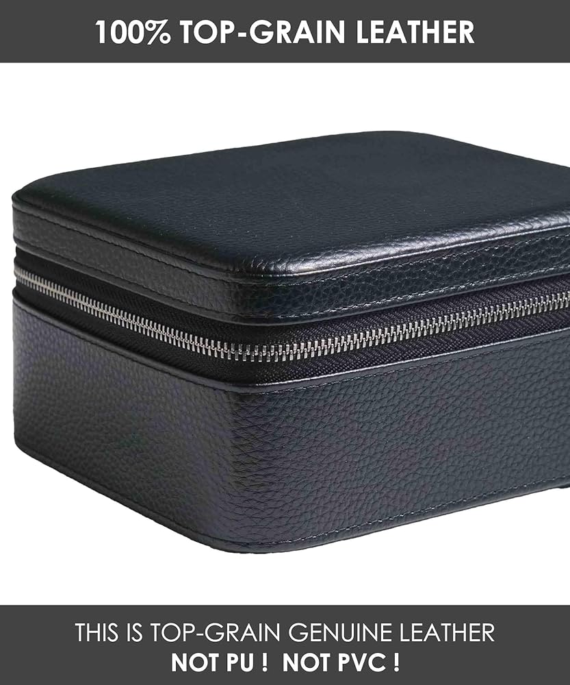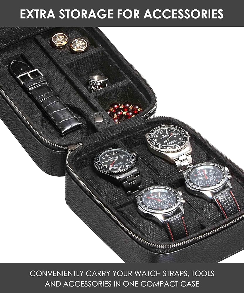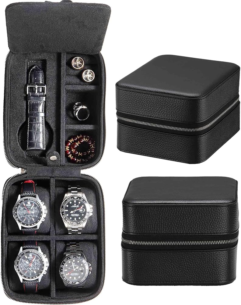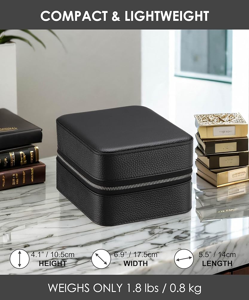 • إكسسوار مثالي للسفر؛ خفيف الوزن ومثالي لقضاء العطلات أو السفر للعمل أو مجرد تخزين ساعاتك وإكسسواراتك القيمة. احتفظ بالخواتم والأساور وأشرطة الساعة الإضافية أو أي ملحقات أخرى في حجرة مقسمة من الأعلى واحتفظ بأربع ساعات آمنة بالأسفل. الأبعاد: 5.5 بوصة × 6.9 بوصة × 4.1 بوصة