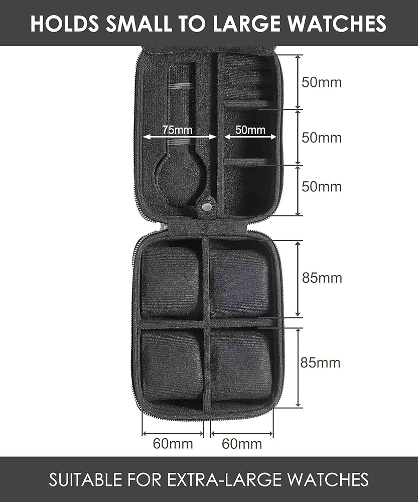 • يناسب أي نمط: سيناسب صندوق الساعة ذو 5 فتحات أي ساعات رجالية أو نسائية، أو ساعة ذكية، أو جهاز تتبع اللياقة البدنية، أو ساعة فاخرة ذات وجه أقل من 60 مم، ويناسب جميع العلامات التجارية والأنماط. محيط الوسادة 7.1 بوصة وقابل للضغط حتى 6 بوصة