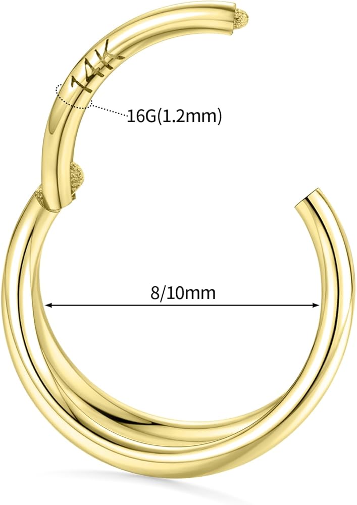 مقياس الحجم واللون: 16 مقياس (السمك: 1.2 ملم). القطر الداخلي: 8 مم (1/3 بوصة). اللون: ذهب أصفر خالص عيار 14 قيراط. يرجى التحقق من القطر الداخلي بعناية وفقًا لجدول المقاسات الخاص بحلقة الأنف الدائرية. اختر المقاس الأنسب لنفسك. يمكن استخدامها كطوق حلقات الأنف، حلقات الشفاه، أقراط هيليكس، حلق الغضروف، أقراط ثقب المحار، أقراط شحمة الأذن