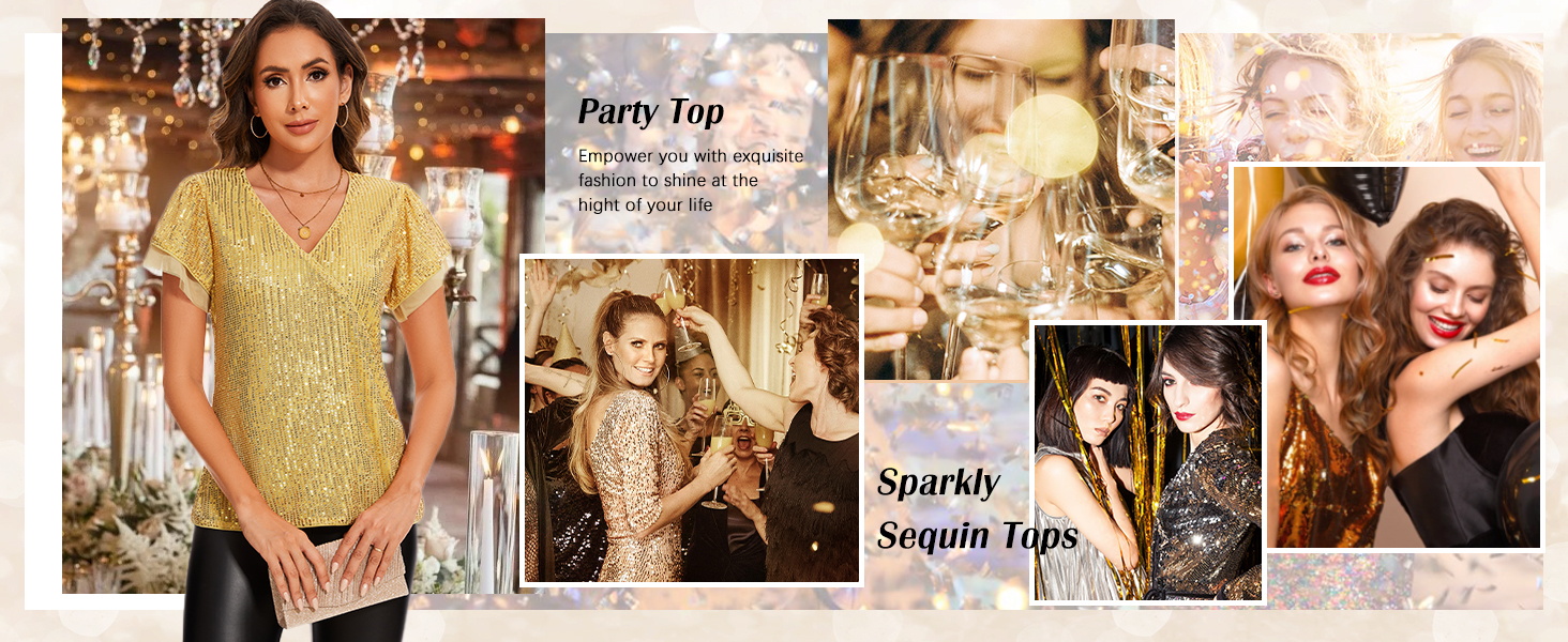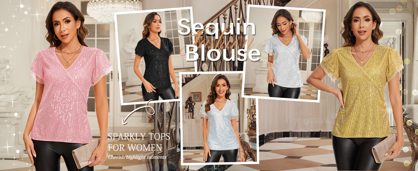 التصميمات: قمصان علوية لامعة للنساء، تتماشى مع المواد المرصعة بالترتر بالكامل، مما يجعلها موضوعًا رئيسيًا لأسلوب لطيف وأنيق لكل امرأة. يُظهر التصميم الأنيق ذو الرقبة على شكل حرف V سحرك الأنثوي الفريد، مثير ولكن أنيق