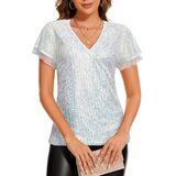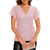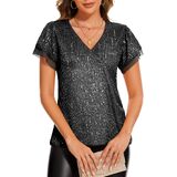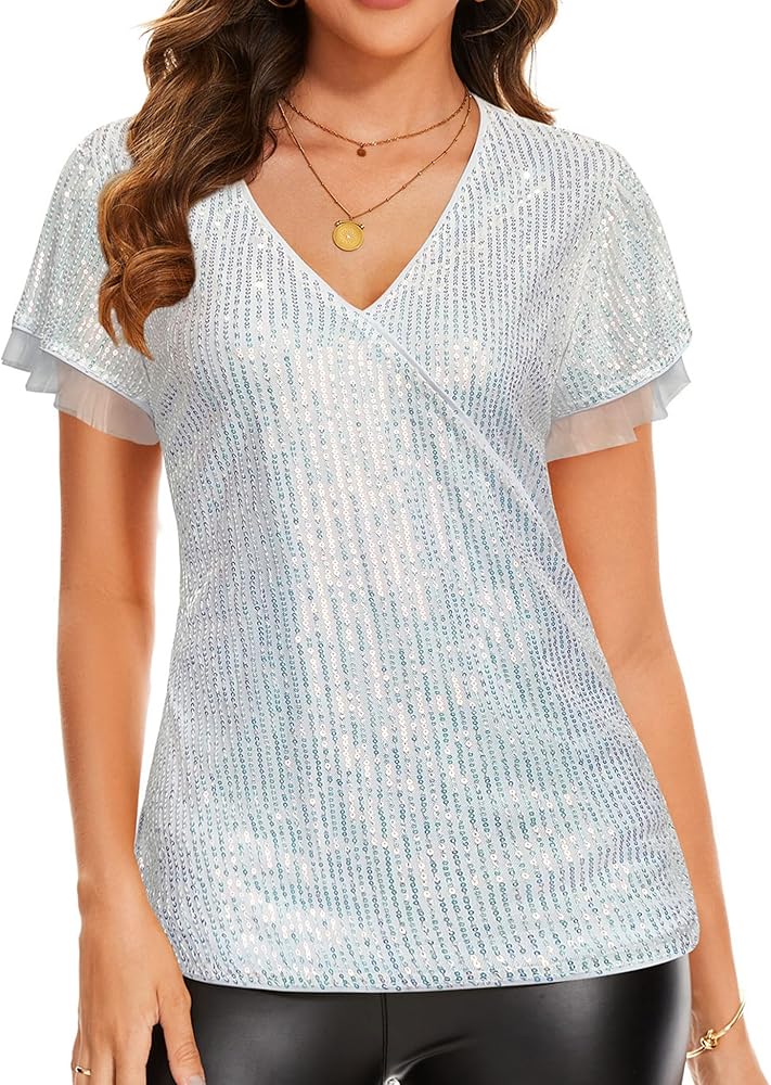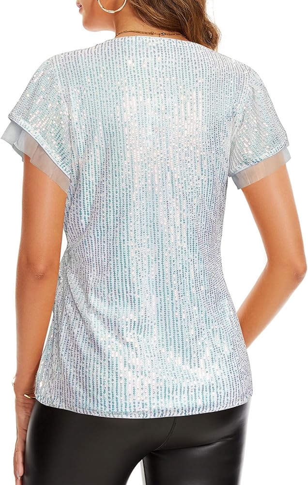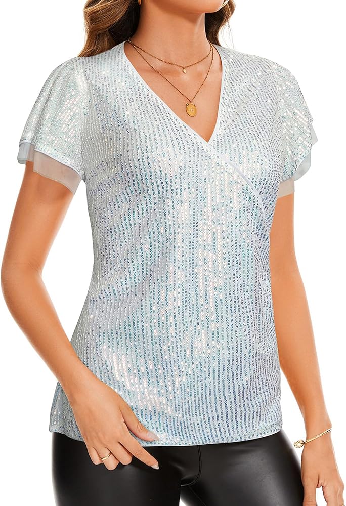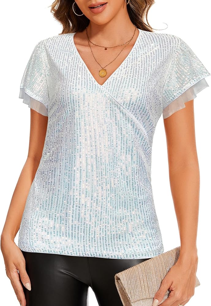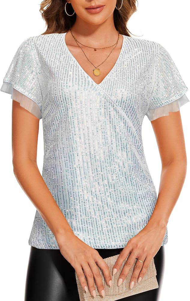 المميزات: قمصان مطرزة بالترتر للنساء، كم قصير مكشكش، رقبة على شكل حرف V أنيقة، مقاس نحيف، خصر مكشكش، ترتر لامع، قمصان نسائية لامعة أنيقة ستجعلك "متألقة" في كل مناسبة