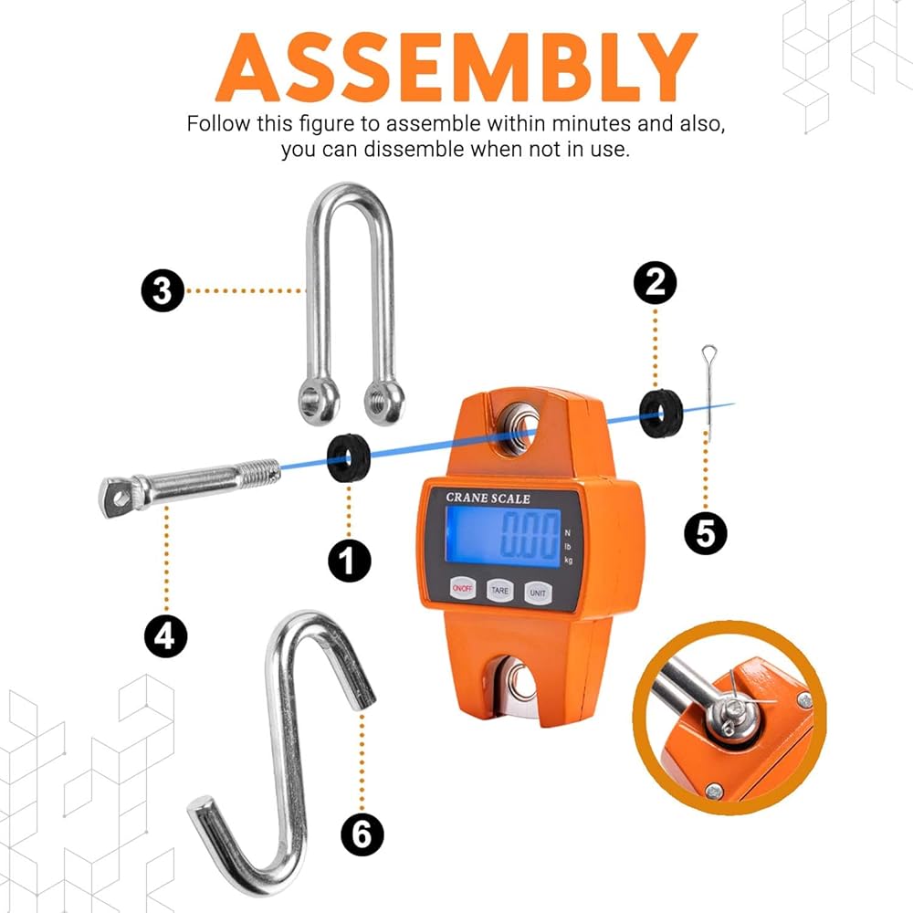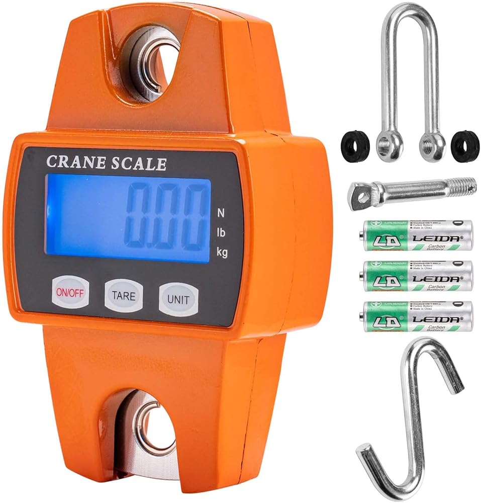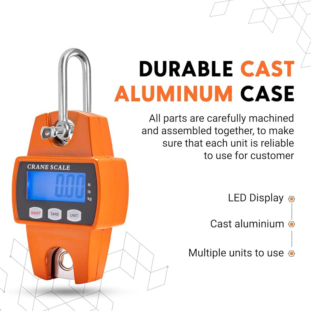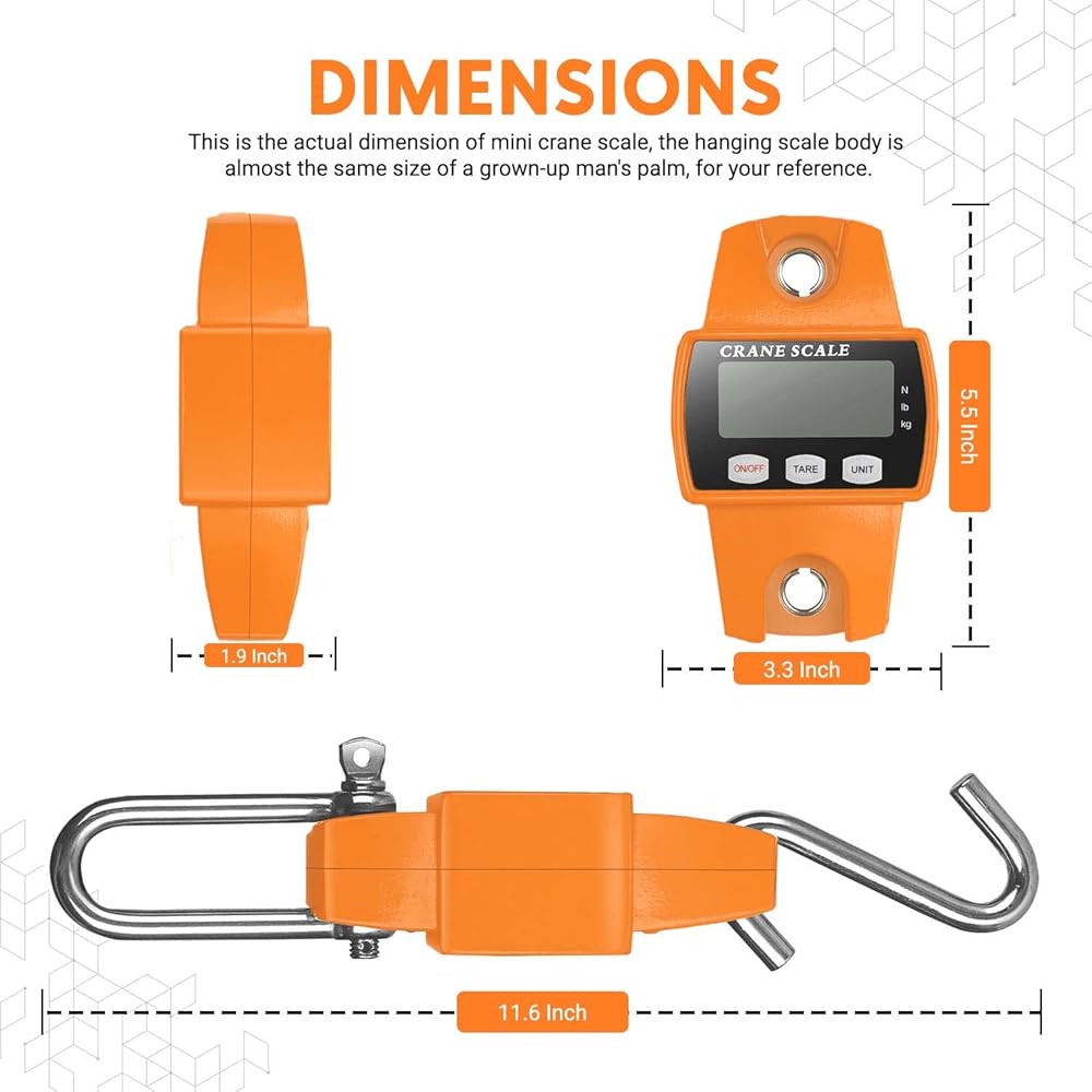 • Designed for ease of use, this mini crane scale features an easy-to-read LCD display that shows weight in either kilograms or pounds, while the included hooks provide a secure hold