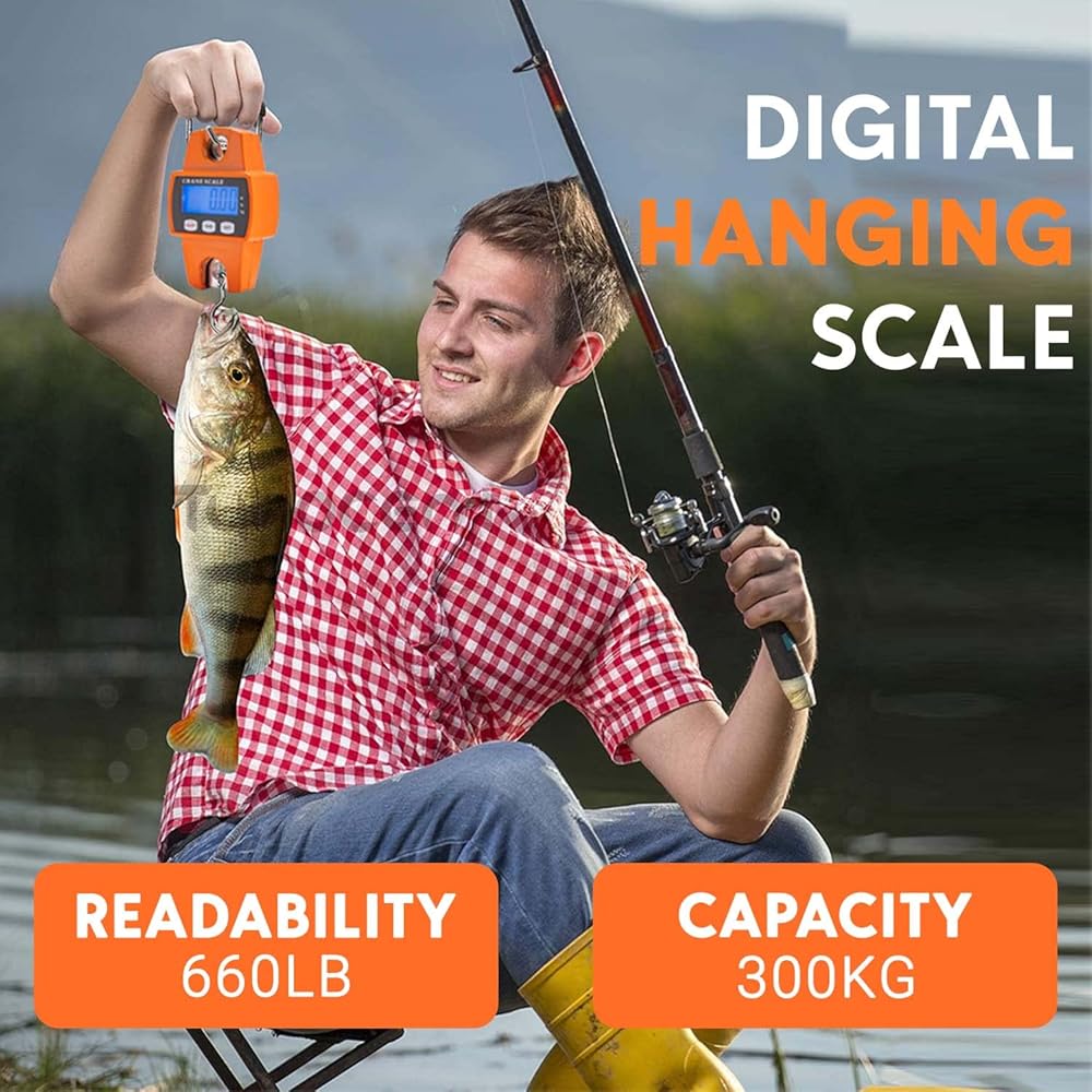 ميزان رافعة صغير محمول باليد 300 كجم مع خطافات للزراعة والصيد وصيد الأسماك والأنشطة الخارجية، مقياس رقمي متعدد الوظائف بوزن 660 رطل، مع علبة من الألومنيوم المصبوب (برتقالي)