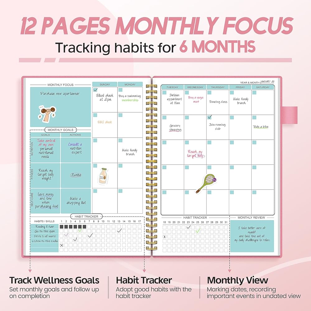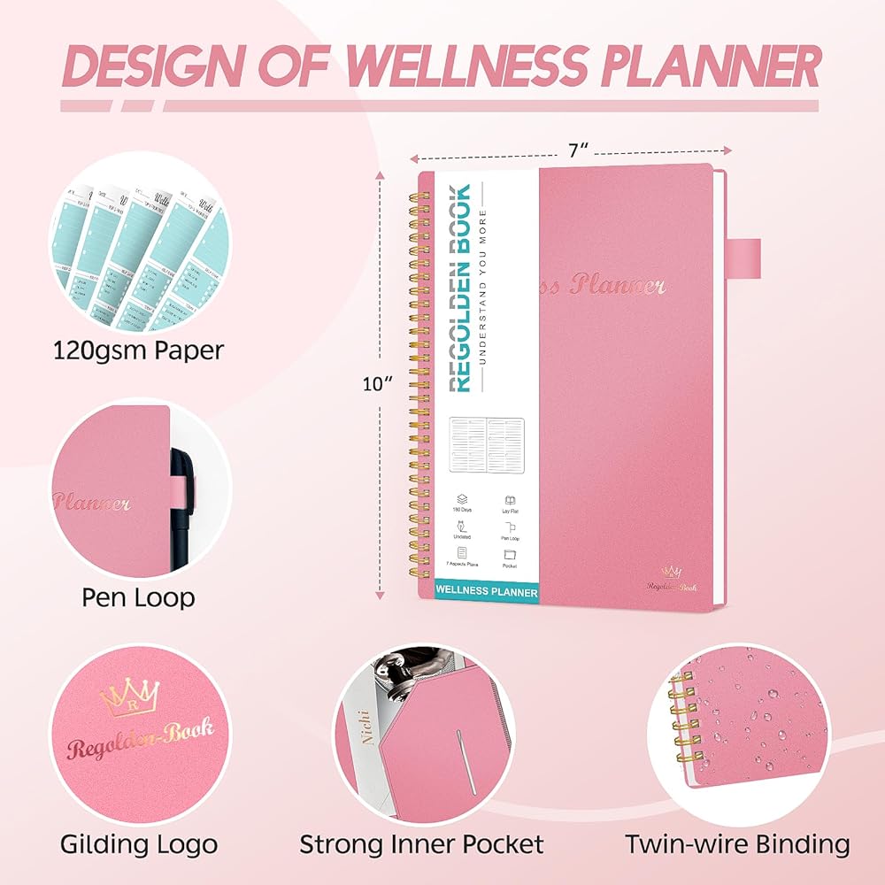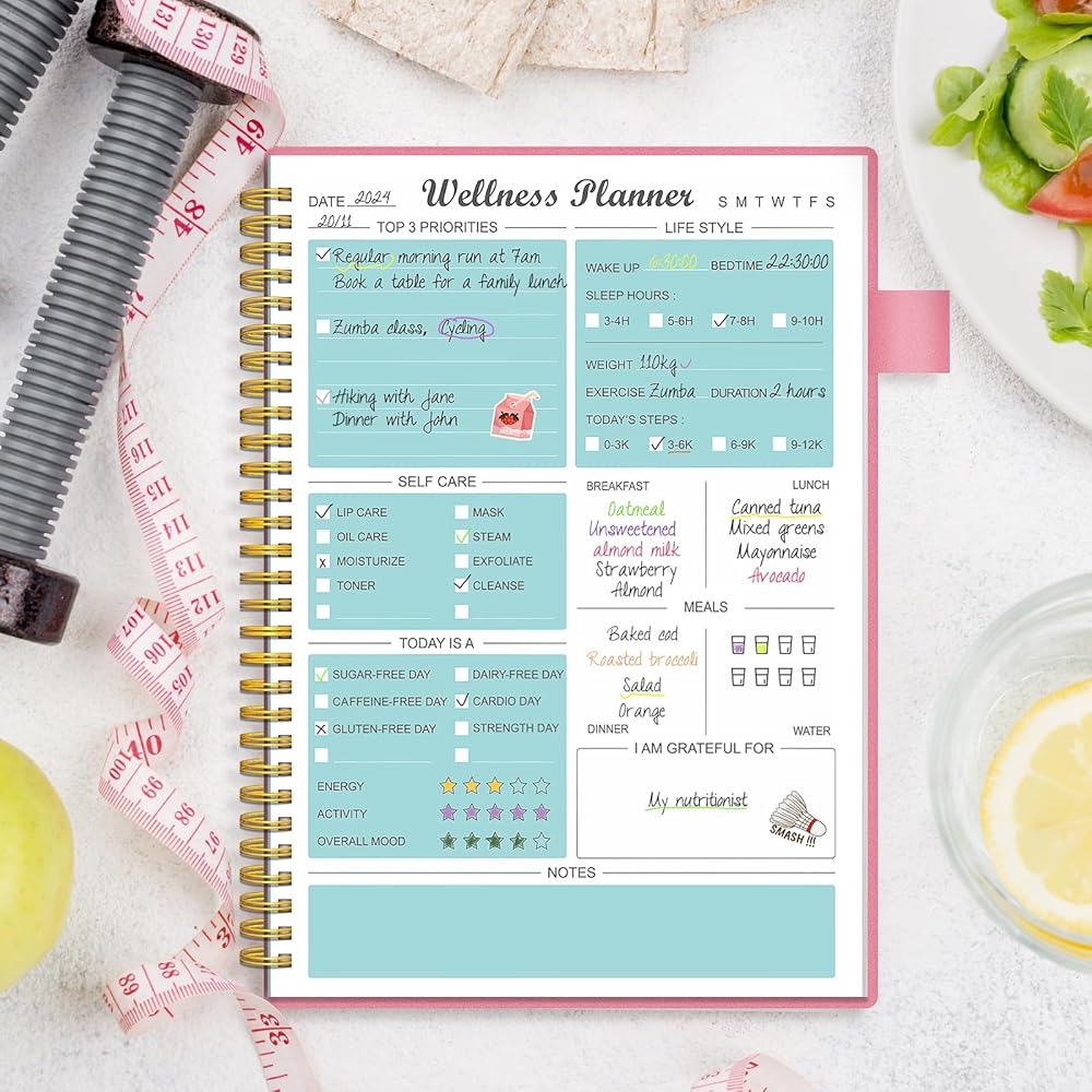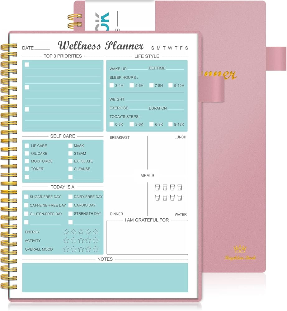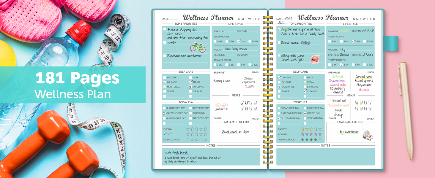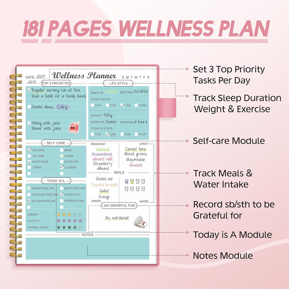 مخطط صحي بتصميم فريد: تغطي المجلة اليومية جميع جوانب الصحة البدنية والعقلية: تحديد أهم 3 أولويات، والامتنان، والنوم، والوجبات، واللياقة البدنية، والرعاية الذاتية، والإلهام، والتأمل اليومي. تحتوي مجلة فقدان الوزن هذه على العديد من اللوحات وهي غنية بالمحتوى، وتغطي جميع جوانب الحياة.