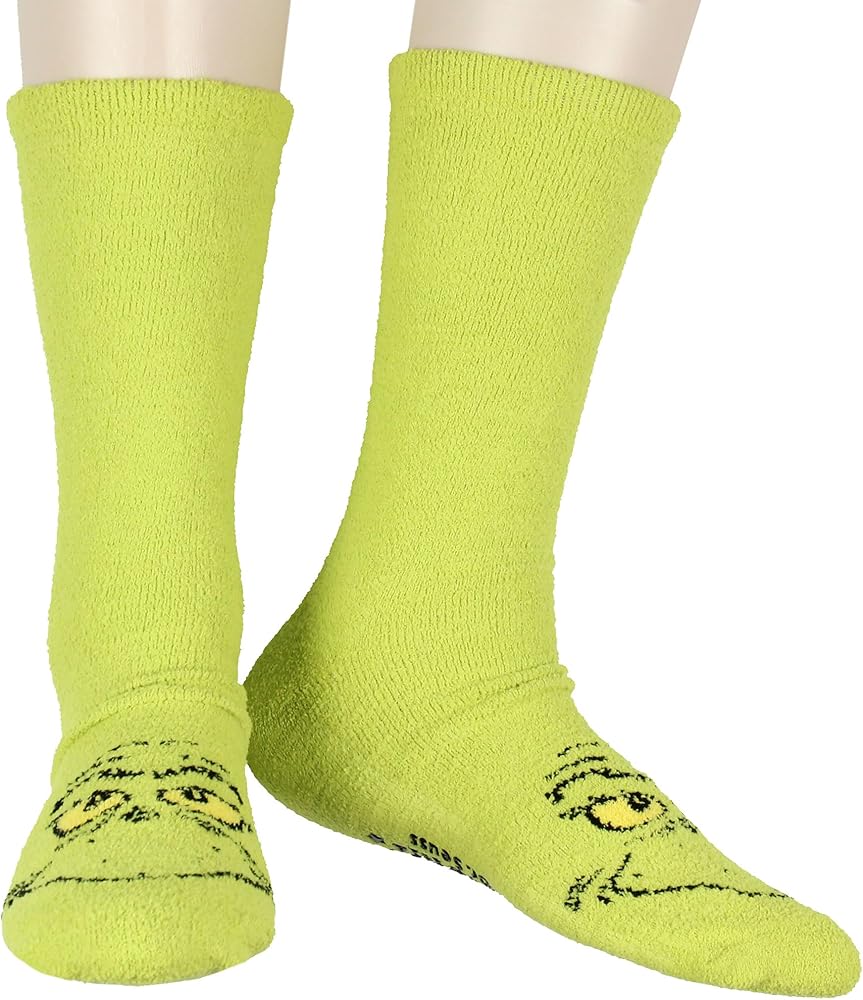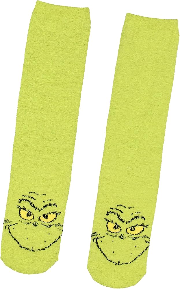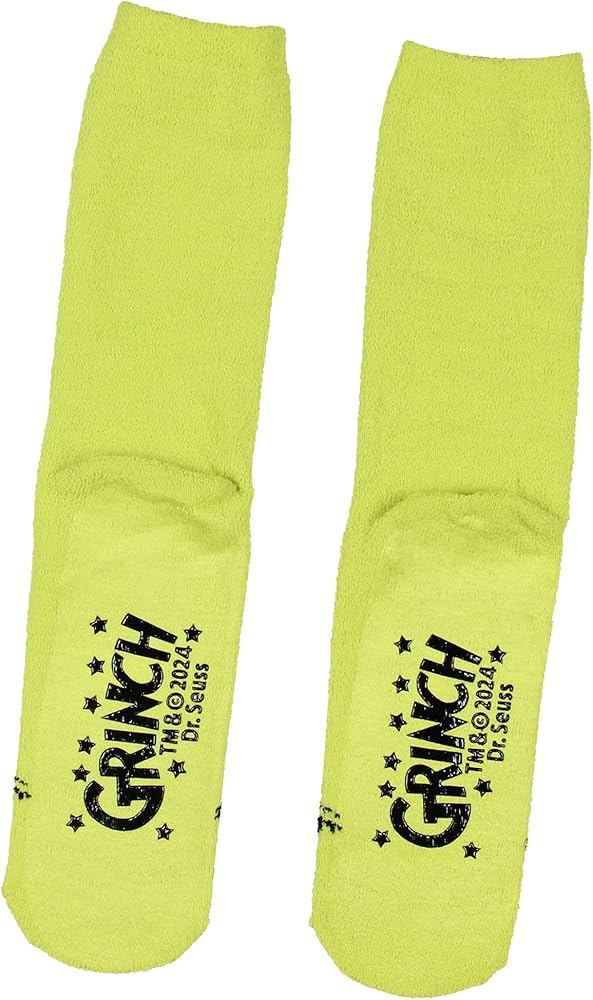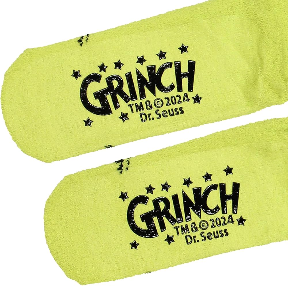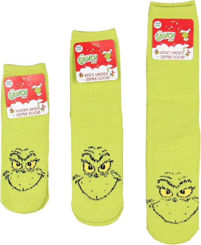 These Dr. Seuss The Grinch Who Stole Christmas matching family fuzzy gripper slipper socks are a must-have for any Grinch fan during the holiday season! Made from a soft blend of 98% polyester and 2% spandex, these cozy crew socks are perfect for keeping feet warm and comfortable. The bottom of the socks features playful Grinch-themed text in raised and textured grippers to help prevent slipping and sliding on smooth surfaces. The socks showcase a fun graphic of the Grinch and his devious smile, capturing his mischievous holiday spirit and making these socks a fun addition to any festive outfit. Ideal for wearing during family Christmas mornings or while watching your favorite Grinch movie, these socks combine style, comfort, and practicality. Machine wash cold with like colors for easy care. One size fits most. Socks are available in sizes ranging from toddler to adult.