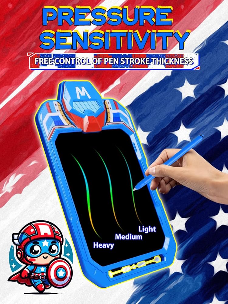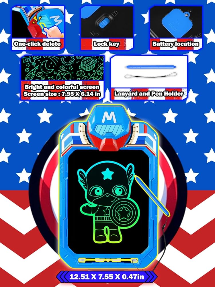 تصميم ثابت، مسح بمفتاح واحد، قفل للشاشة - يتميز القلم بحزام مضاد للضياع وفتحة للقلم للتخزين المريح. من خلال إدخال القلم في الفتحة، يمكنك وضع الجهاز اللوحي في وضع مستقيم لعرض الأعمال الفنية لطفلك. اضغط على الزر الموجود على رأس البطل لمسح الشاشة على الفور. يمنع مفتاح القفل الخلفي المحو العرضي للأعمال المهمة.