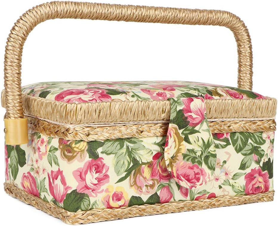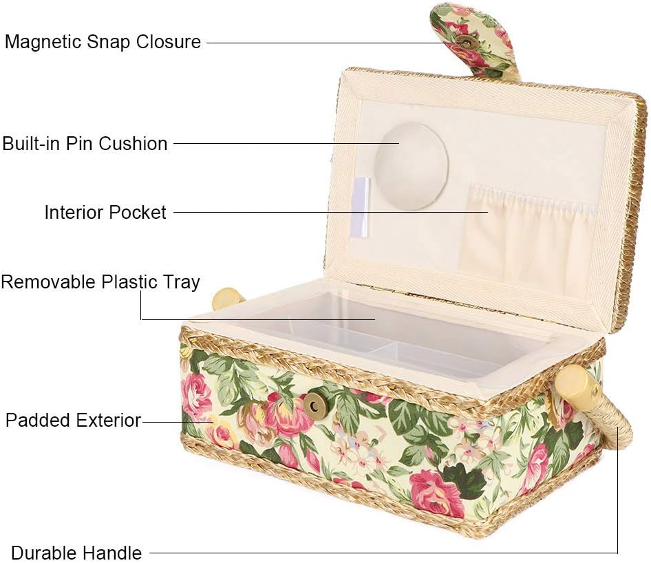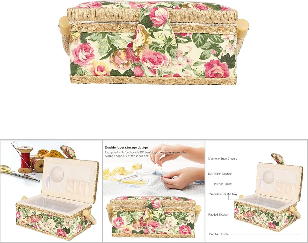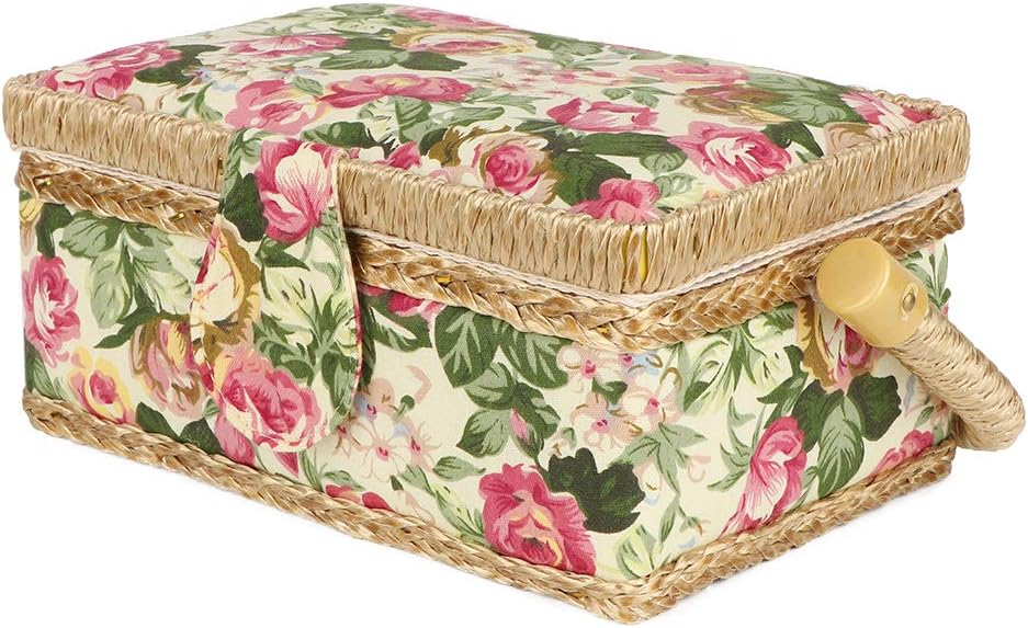• 【Stylish Design】------ The vintage sewing basket boasts a classic design with enchanting charm. The unique texture of the floral print fabric is accentuated by exquisite trim details, making it a fashionable accessory in addition to its practical uses.