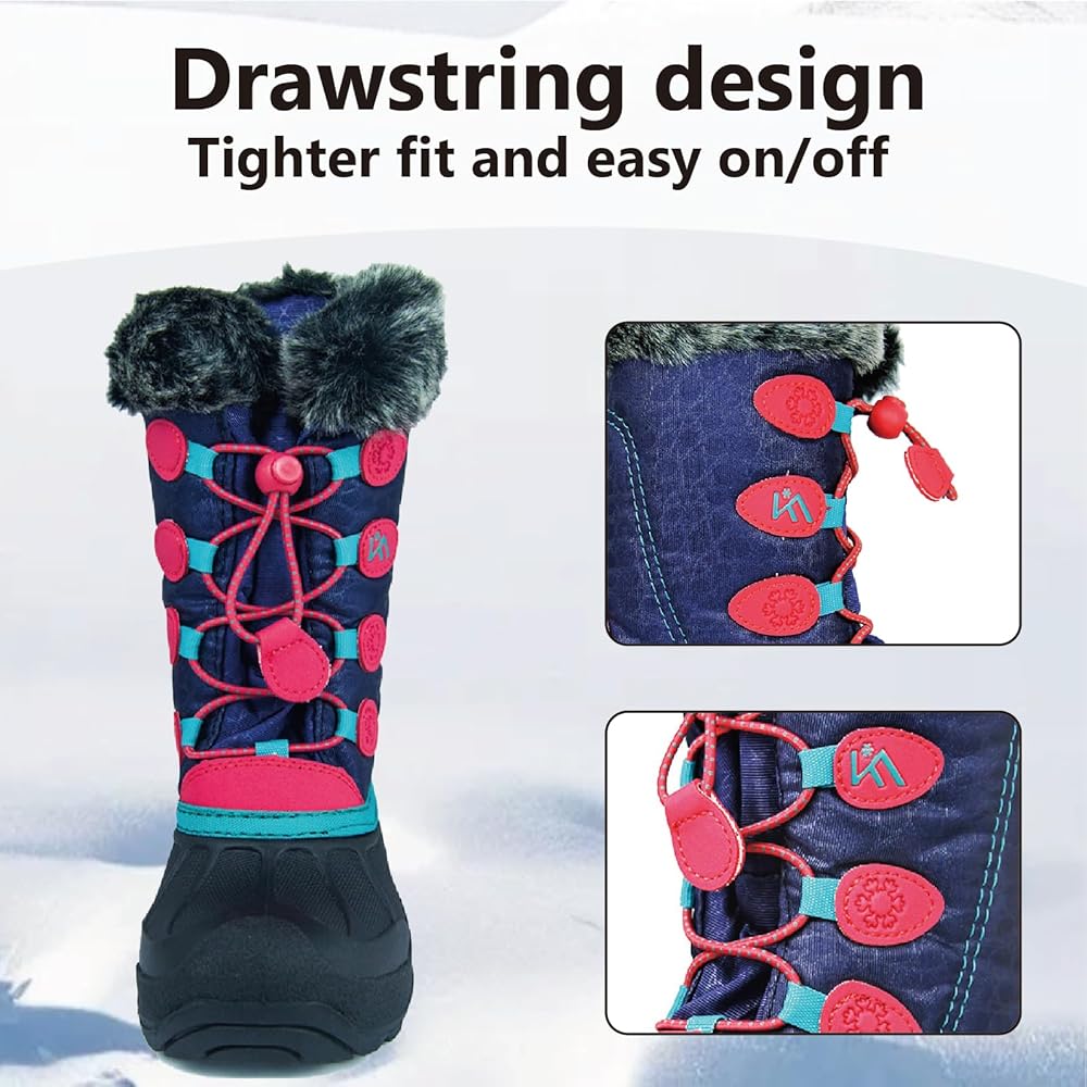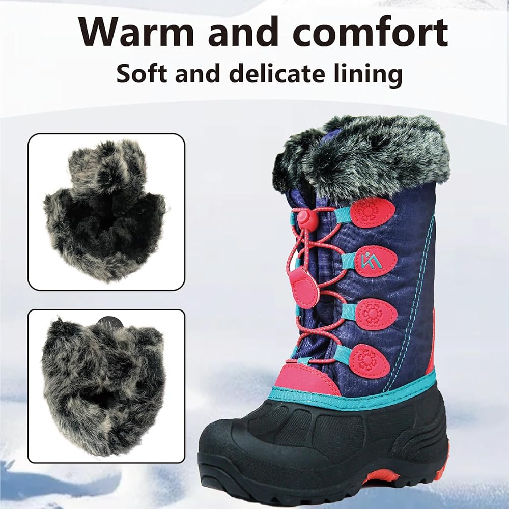 تصميم داخلي مريح ودافئ: تلتقي الراحة بالدفء في أحذية الثلج للأطفال الصغار، مع ياقة طويلة من القطيفة وبطانة صوف قصيرة ناعمة تمتد إلى أصابع القدم. تم تصميم أحذية الثلج للأطفال هذه لتحمل البرد الشديد، وتوفر عزلًا استثنائيًا، مما يحافظ على دفء الأقدام الصغيرة حتى في درجات الحرارة المنخفضة التي تصل إلى -20 درجة مئوية.