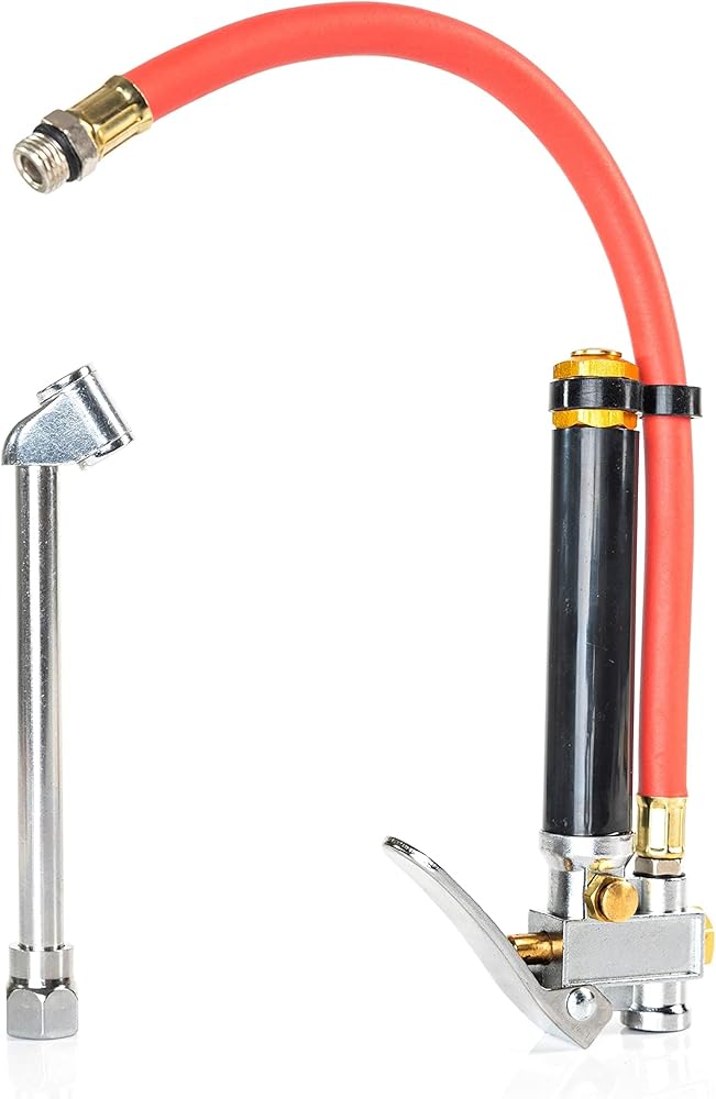 نيكو 20701A منفاخ الإطارات | 12 بوصة | مقياس ضغط الهواء المرن | 20 - 120 رطل لكل بوصة مربعة | ظرف مزدوج الرأس مقاس 1/4 بوصة NPT | حشو الإطار بخرطوم | جسم من الألومنيوم وصمامات نحاسية | أغطية الصمامات الجذعية