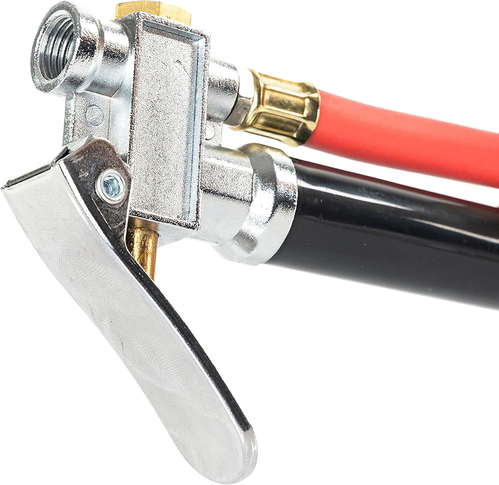 • خرطوم هواء أحمر: حشو الإطارات مقاس 12 بوصة مزود بمقياس متصل بخرطوم مطاطي مرن عالي التحمل. مدخل خيط أنثى قياسي 1/4 بوصة NPT. يوفر منفاخ الهواء نفخ هواء الإطارات بسهولة وتحكم وتفريغ الإطارات من خلال فوهة ضغط الإطارات الهوائية المرفقة.