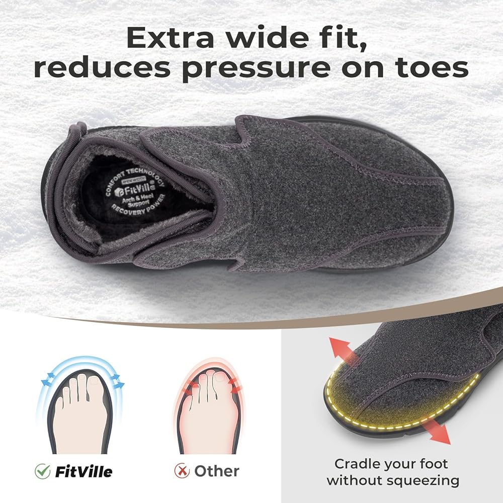 حزام قابل للتعديل بالكامل: أحذية Fitville العريضة لمرضى السكري سهلة الارتداء والخلع، مما يضمن ملاءمة آمنة وشخصية. الأحذية مريحة حقًا بمجرد تثبيتها. يسمح لك الخطاف والحلقة بالانزلاق داخل هذا الحذاء بسهولة.