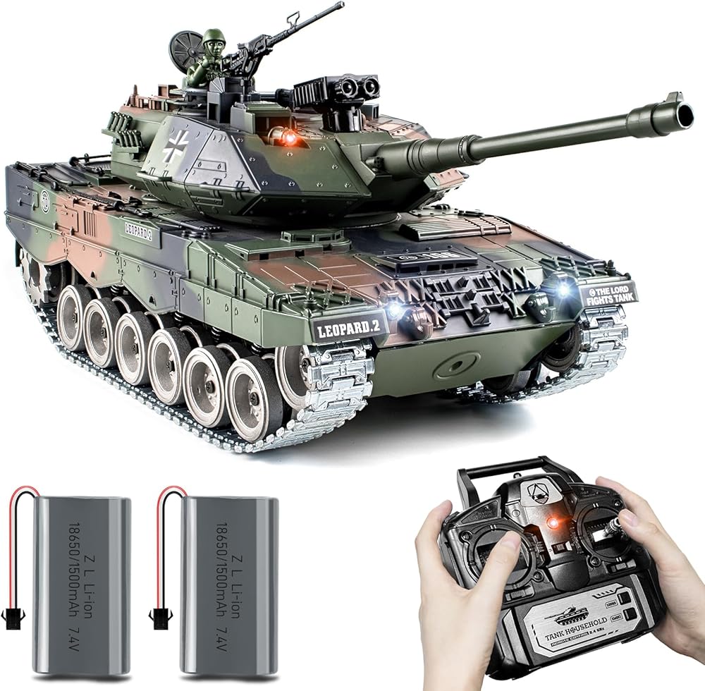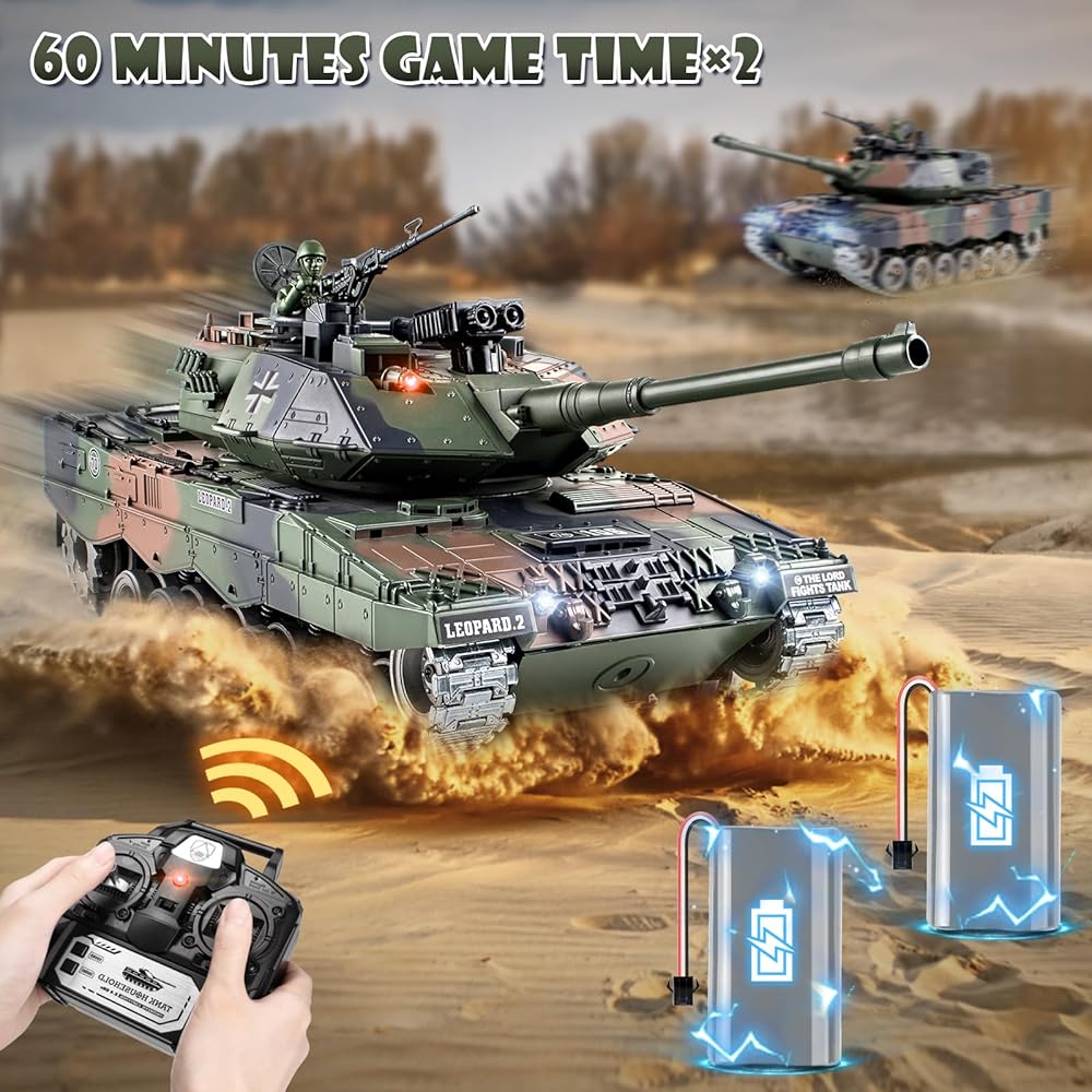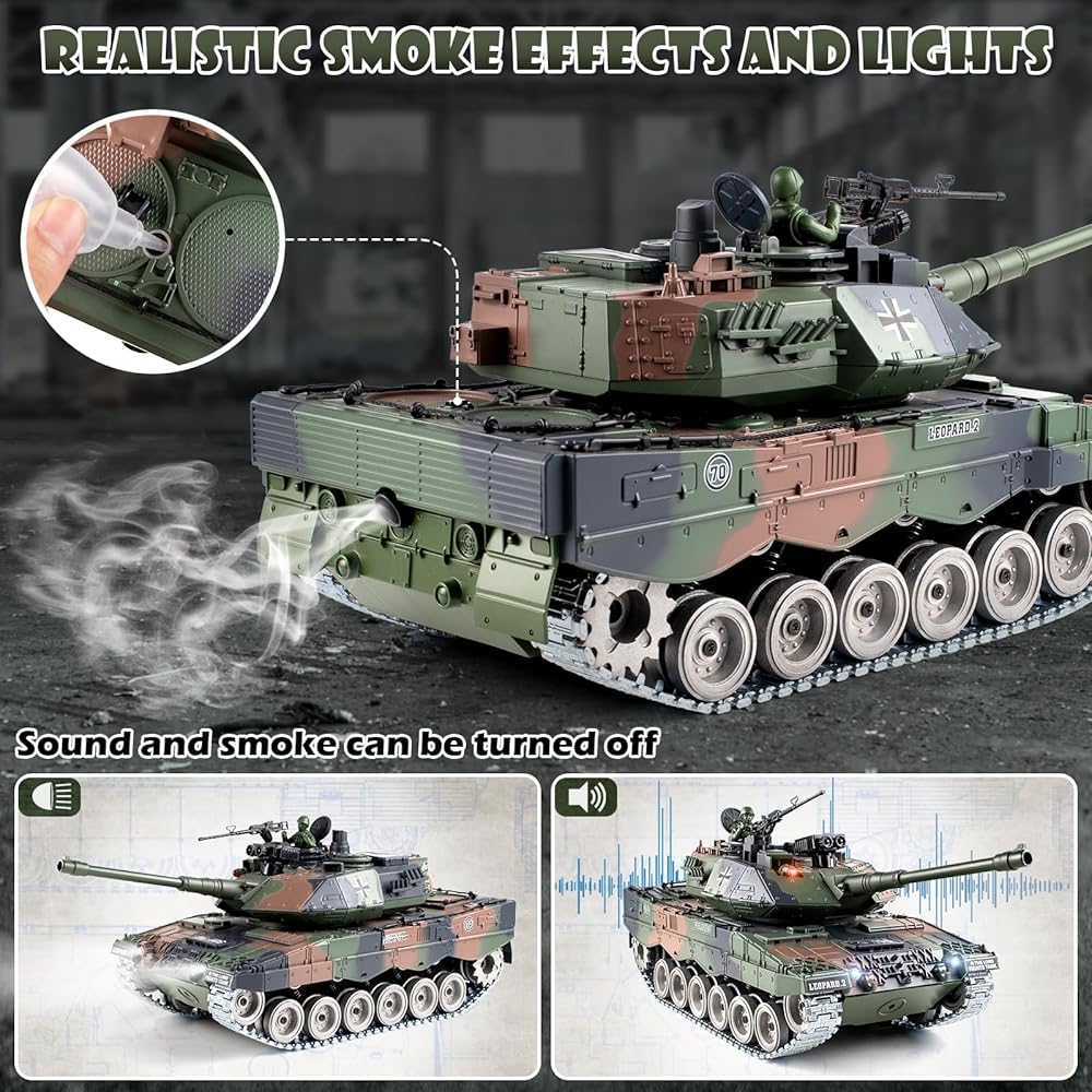 1:18 دبابة RC، 2.4 جيجا هرتز معدن ألماني ليوبارد II نموذج التحكم عن بعد، دبابة عسكرية RC مركبة تطلق BBS وقنابل الماء، لعبة الجيش للبالغين والأطفال مع الدخان والأضواء والصوت والارتداد