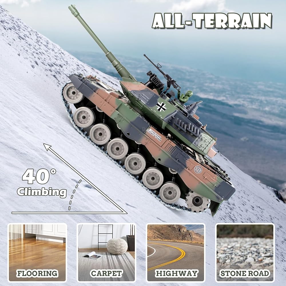 【ألعاب محاكاة دبابة المعركة】: دبابة Leopard 2 RC للبالغين والأطفال لديها الكثير من الوظائف، بما في ذلك الدوران للأمام والخلف، والدوران الأيمن والأيسر، والدوران المركزي 360 درجة، والبرج دوران 330 درجة، والأسطوانة 30 درجة لأعلى وأسفل، والارتداد، والدخان. ، الصوت والأضواء، إطلاق الادسنس bbs والرصاص المائي، منحدر التسلق 40 درجة. (يمكن إيقاف الصوت والدخان).