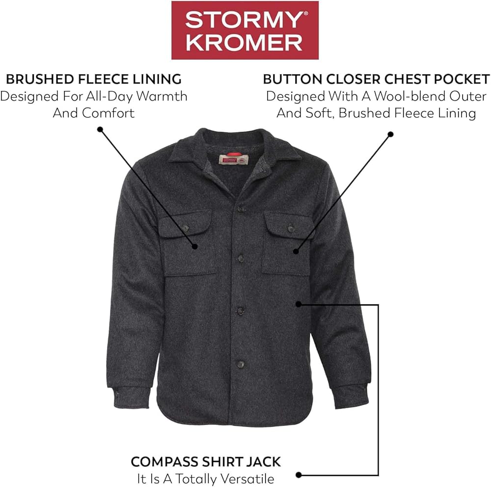Indulge in the perfect blend of rugged versatility with Stormy Kromer's Compass Shirt Jacket, a favorite among men for a good reason. This shirt jacket effortlessly adds a touch of rugged polish over your favorite sweatshirt or tee, striking the ideal balance without unnecessary bulk. Crafted for those in between seasons, the Compass features a wool blend outer layer, combining wool and nylon for durability. The soft and luxurious brushed fleece lining ensures comfort and style. Complete with two button closure chest pockets and a button front, this shirt jacket is not just an essential, it is designed to elevate your look with comfort.