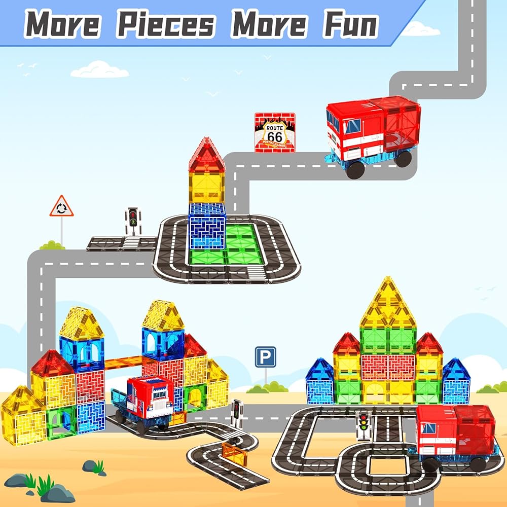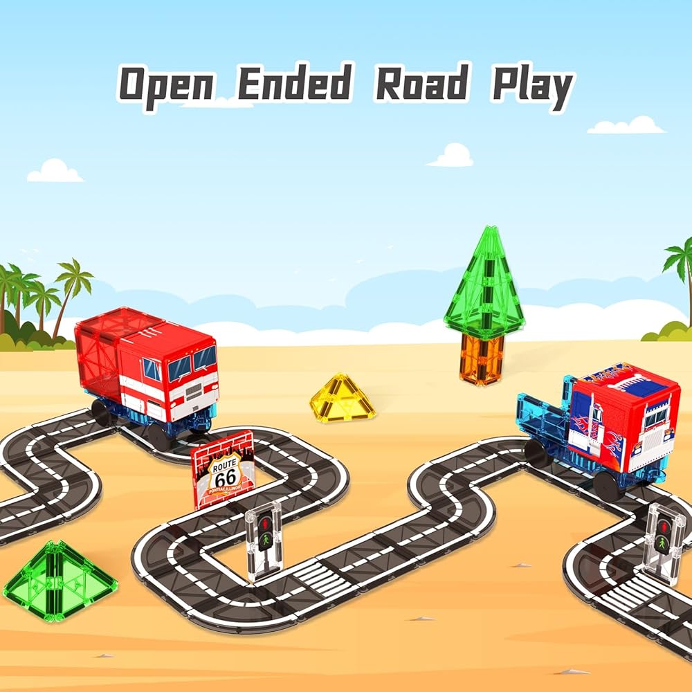 مجموعة طريق البلاط المغناطيسي مع شاحنة، مكعبات بناء مغناطيسية ألعاب للأطفال الصغار لعمر 3 سنوات فما فوق للأولاد والبنات، ألعاب بناء مونتيسوري للأطفال، ألعاب حسية جذعية، هدايا عيد ميلاد تعليمية لمرحلة ما قبل المدرسة