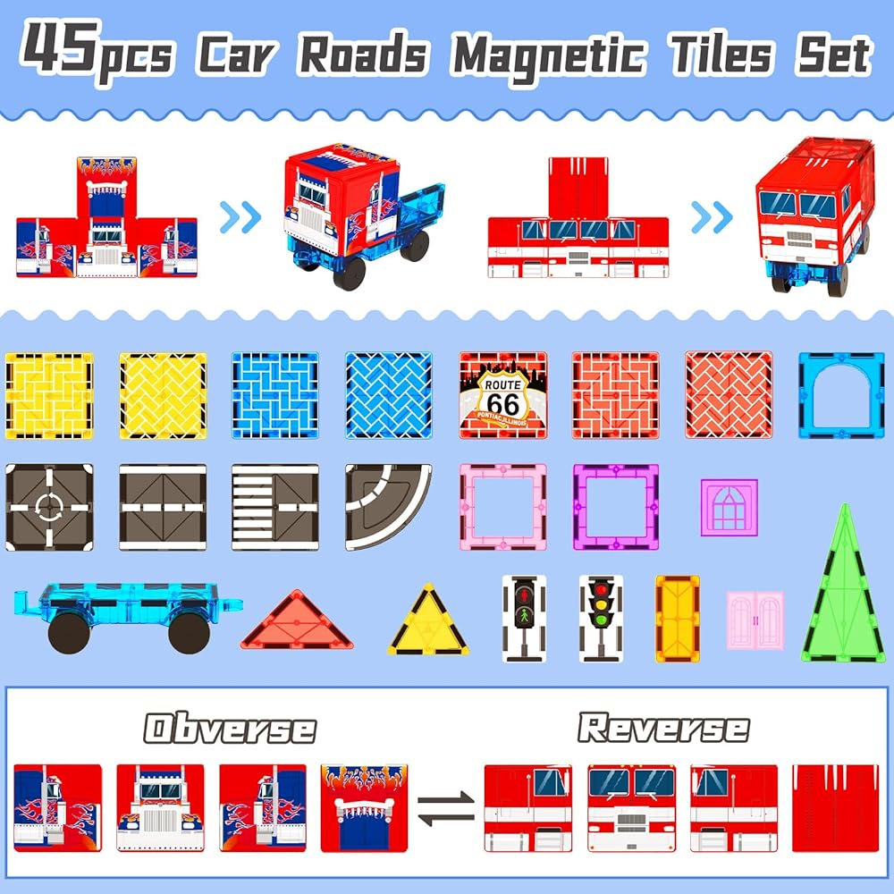 بلاط مغناطيسي على شكل طريق - شجع الإبداع والخيال مع البلاط المغناطيسي المطور 45 قطعة من Bigshu، استنادًا إلى الأشكال الأساسية الأصلية مثل المربعات والمستطيلات والمثلثات والأسوار، تضيف هذه المجموعة المطورة العديد من عناصر الطريق مثل الطرق والممرات والشاحنات وإشارات المرور والأسطح والمزيد، والتي يمكن أن تساعد الأطفال على تجربة متعة البناء بشكل أكثر واقعية، مما يخلق فرصة للأطفال لبناء طرقهم الفريدة مثل "مصمم الطرق".