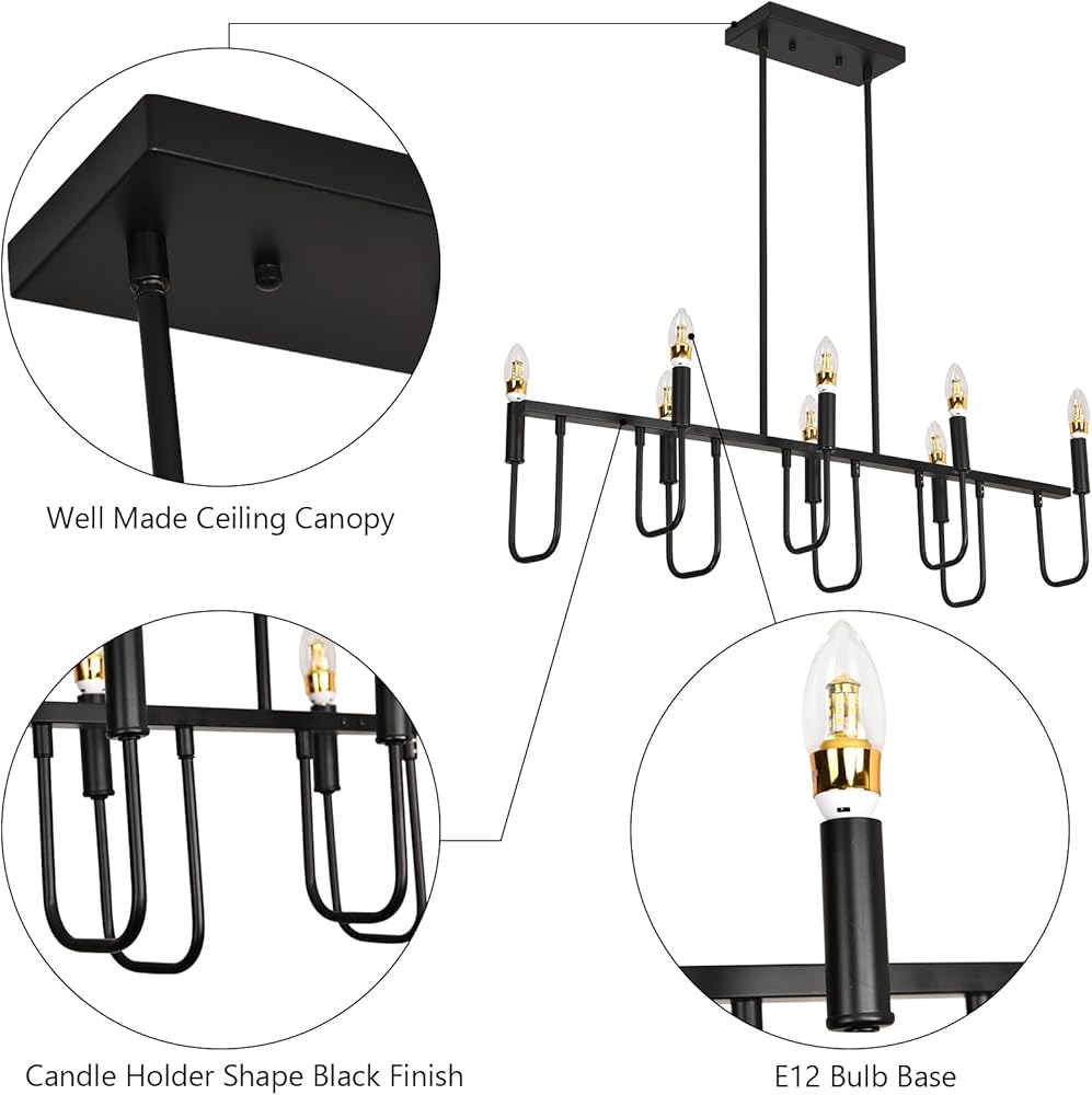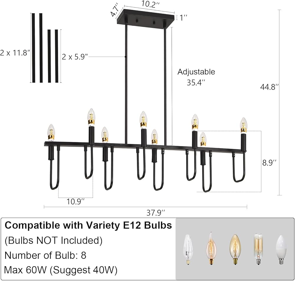 【مصدر ضوء 8 E12 】تتطلب ثريا 8 فروع 8 مصابيح E12 × (بحد أقصى 60 وات لكل لمبة ولكنها تشير إلى 40 وات). متوافق مع مصابيح LED وEdison وCFL والمتوهجة والهالوجين (المصباح غير متضمن). تعمل إضاءة جزيرة المطبخ هذه أيضًا مع لمبة قابلة للتعتيم مع مفتاح باهت متوافق (لا يتم تضمين المصابيح والمفاتيح)