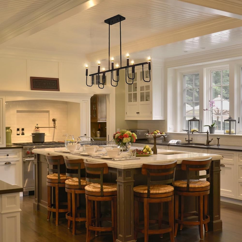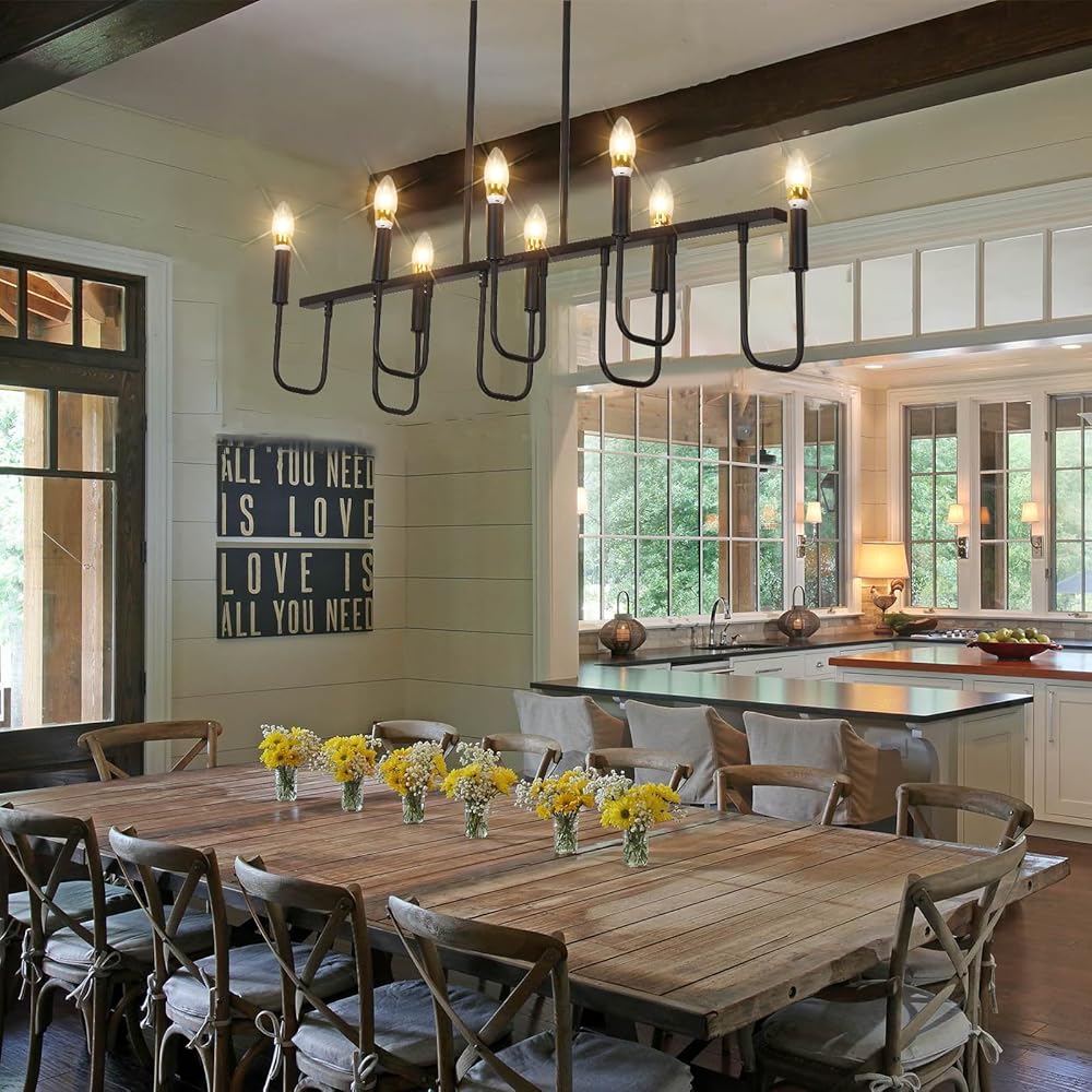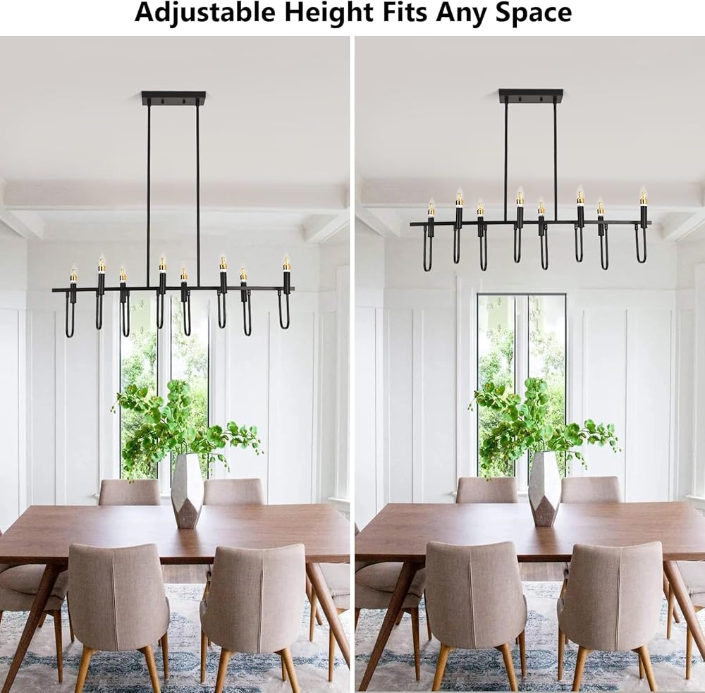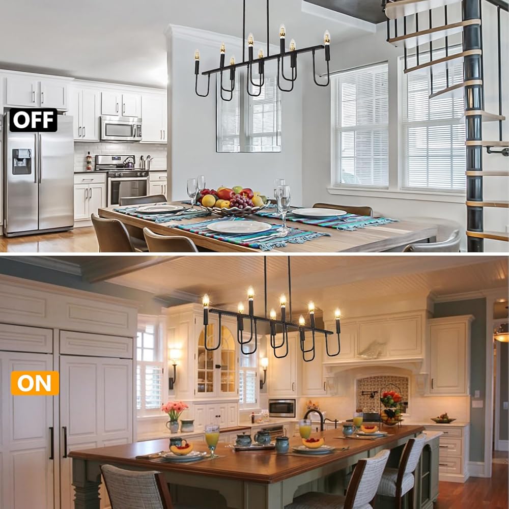 【ثريات المزرعة لغرفة الطعام】هذه الثريا الخطية مصنوعة من المعدن وتدعم لمبة على شكل شمعدان من خلال 8 أذرع حديدية منحنية، ويضرب إطارها على طراز الشموع الكلاسيكي الكلاسيكي، وحرفية بسيطة وتصميم قديم يضفي مظهرًا أنيقًا، ويمكن أن يكون مثل تركيبات إضاءة غرفة الطعام معلقة، أضواء الجزيرة للمطبخ