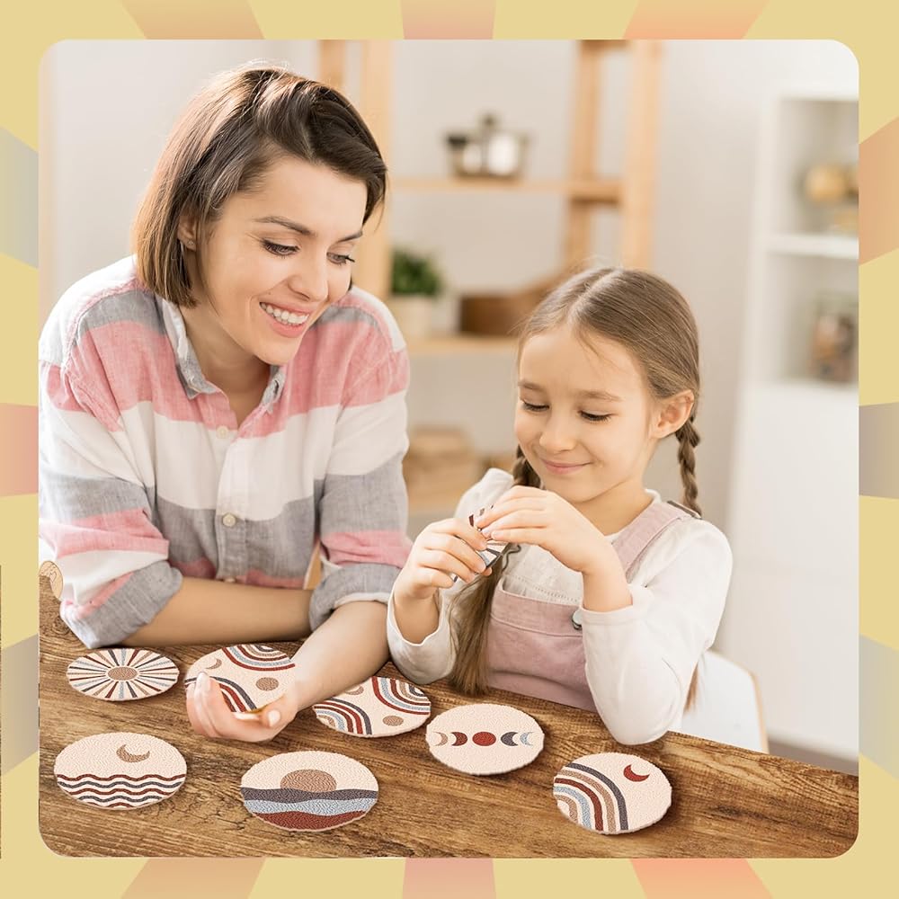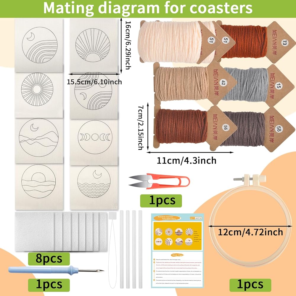 【Punch needle coasters kit for kids beginners】The punch needle kit for beginners contain 6pcs cloths with patterns, 6pcs adhesive felts, 1set enough colors cotton yarns, 1pc embroidery hoop, 1pc sewing thread,6pcs handle tools,3pc adhesive,1 pc scissors and 1 instruction;The punch needle kits comes with everything you need to create beautiful coasters using a punch embroidery kit technique. The instructions are clear and easy to follow, even if you're new to the craft.