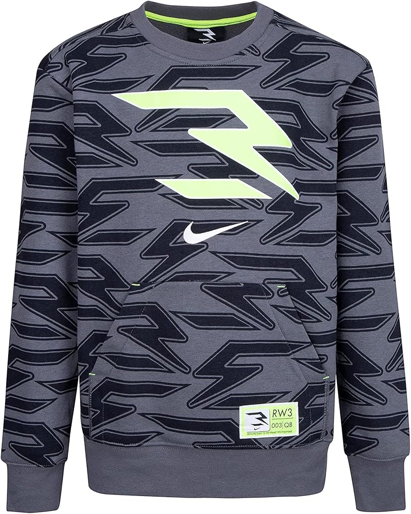 Russell Wilson's 3BRAND brings sport, music and fashion together in an on-trend sportswear brand that inspires us to be better, do more, and give back. 3BRAND believes the mind, body and soul combine to make dreams come true. A percentage of all 3BRAND sales are donated to the Why Not You Foundation, Russell and Ciara's nonprofit organization dedicated to fighting poverty through education, empowering youth to lead with a why not you attitude. RW3 Signature Crew (Big Kids). Long sleeves. Soft sueded fleece. Crewneck. Ribbed collar. Kangaroo pocket. Elastic, ribbed hem and cuffs. Dangeruss print on sleeve. Nike x 3BRAND logos. 60% cotton, 40% polyester. Machine wash. 3BRAND Kids RW3 Signature Crew (Big Kids)