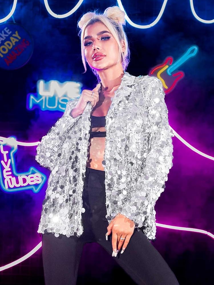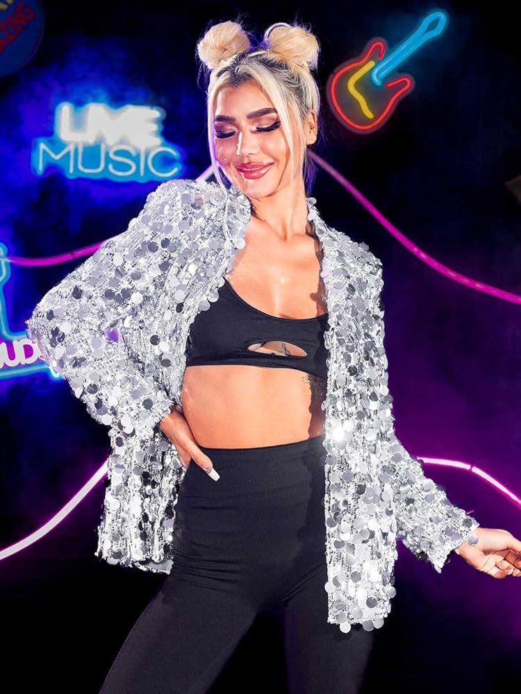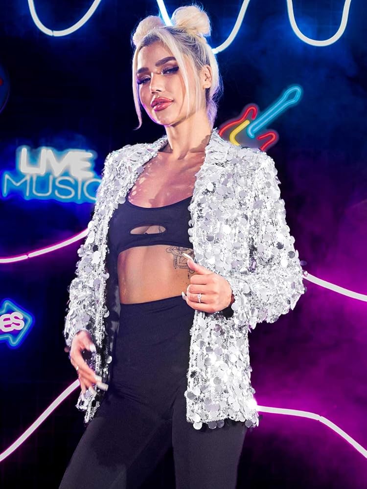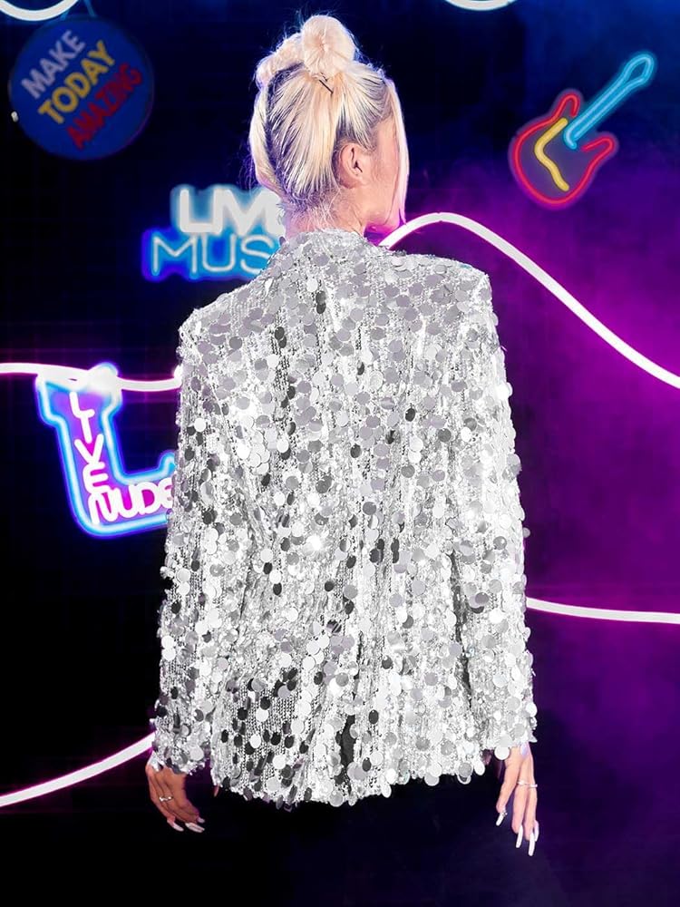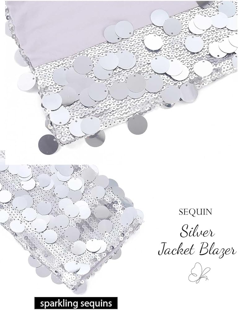 GORAIS Silver Sequin Blazer Sparkly Dot Sequins Jacket for Women. Stylish bling jackets can be dressy or casual. Long sleeve jacket meets the need to cover up a sleeveless formal gown while adding a touch of warmth to cool night. Gorgeous jackets are suitable as part of a rave, disco ball, New Year's Eve event, stag party, bachelorette party, reception, birthday, prom, holiday work party, date night, stage show, club. Also suitable to wear when you are a guest at a dinner or wedding. Sequin jacket has a bright shine that reflects a fun effect in the light, making easy to stand out from the crowd. Pop sequin blazer can add pizzazz to an outfit.You can have a joyful time when wearing it and spend the good night.