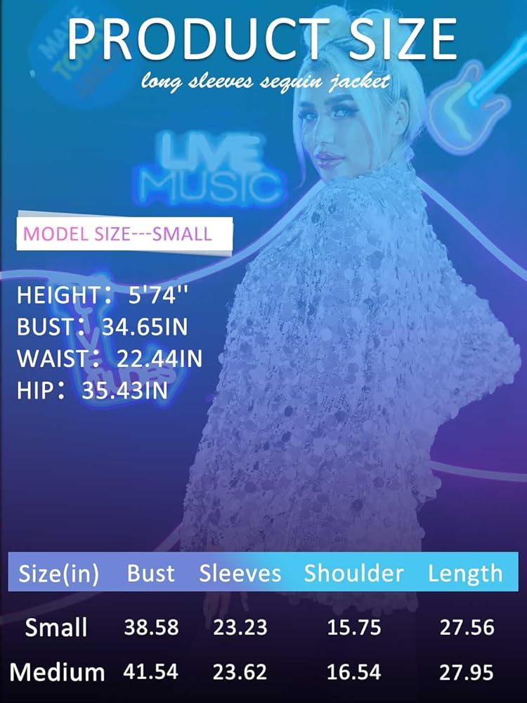 Sequin blazer jacket come with Small and Medium size.Please see the fifth image for detailed measurements.
