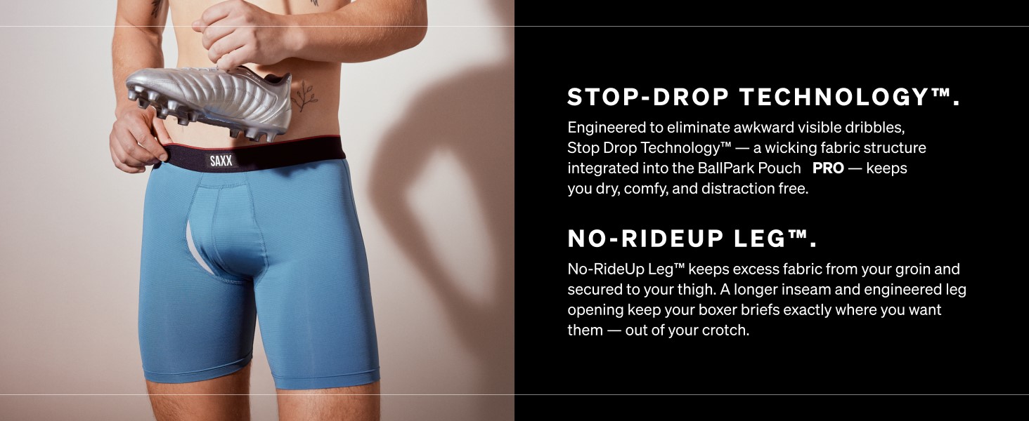 STOP DROP TECHNOLOGY: Deal with those awkward post-pee dribbles thanks to Stop Drop Technology: a wicking fabric structure that we've integrated into the BallPark Pouch of Multi-Sport Mesh to keep you dry and discomfort free.