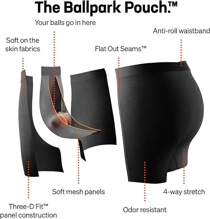 BALLPARK POUCH PRO: Our men's underwear comes equipped with the patented-protected BallPark Pouch to eliminate chafe and keep your manhood in place with breathable mesh panels for life-changing comfort.