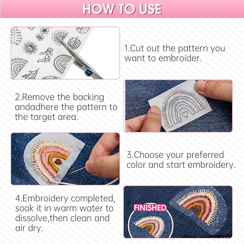 【جعل التطريز أسهل】ما عليك سوى اختيار النمط المرغوب فيه من ورق التطريز، ثم لصقه على القماش والبدء في الغرز. أخيرًا قم بإذابته في الماء الدافئ لإزالة الورق الزائد.