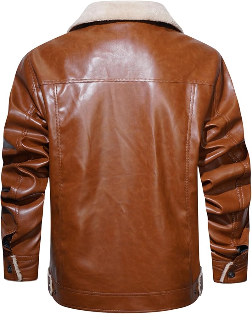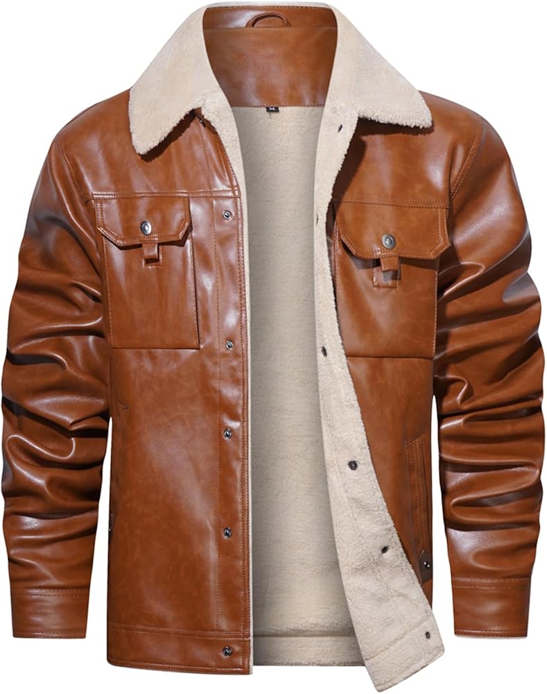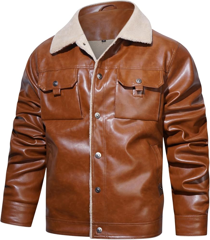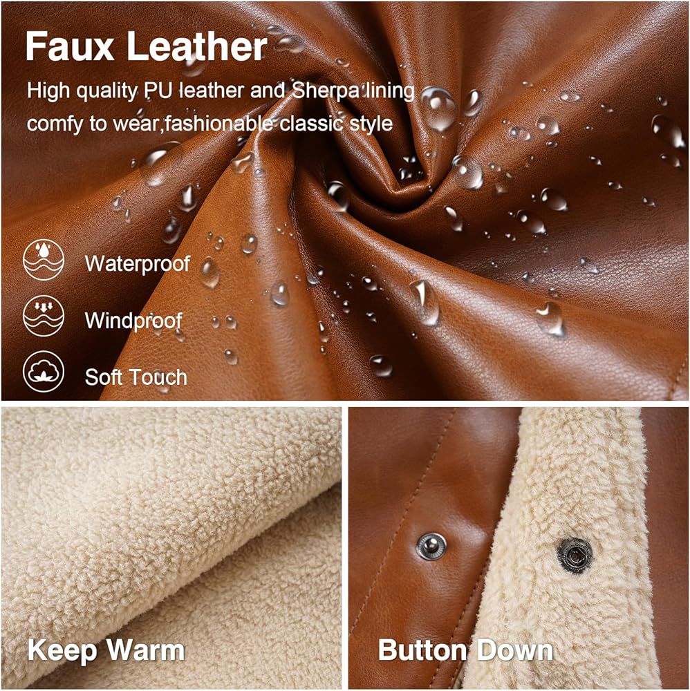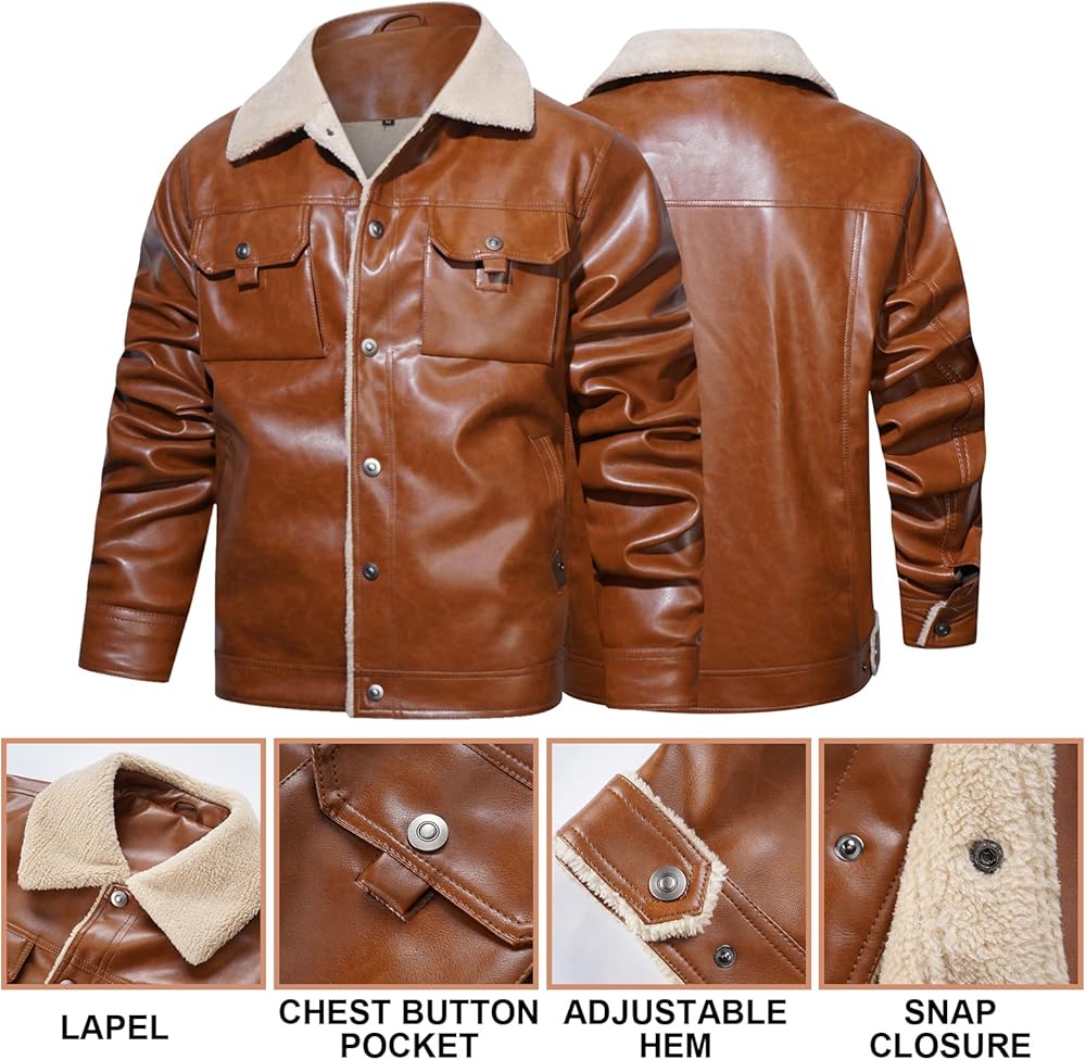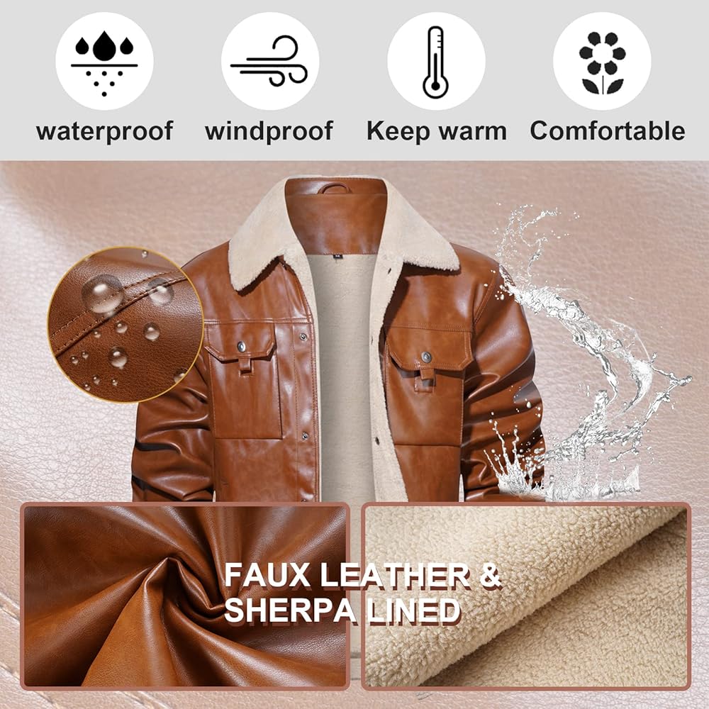 【القماش】هذا الجاكيت الرجالي من الجلد الصناعي مع بطانة كاملة من الشيربا وياقة سميكة وناعمة، مما يوفر راحة ودفء ممتازين في الخريف والشتاء البارد.