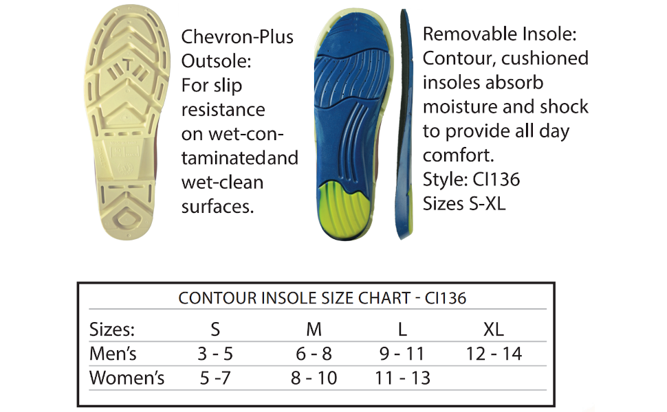 Outsole material is soft for excellent slip resistance and walking comfort while offering good abrasion and chemical resistance