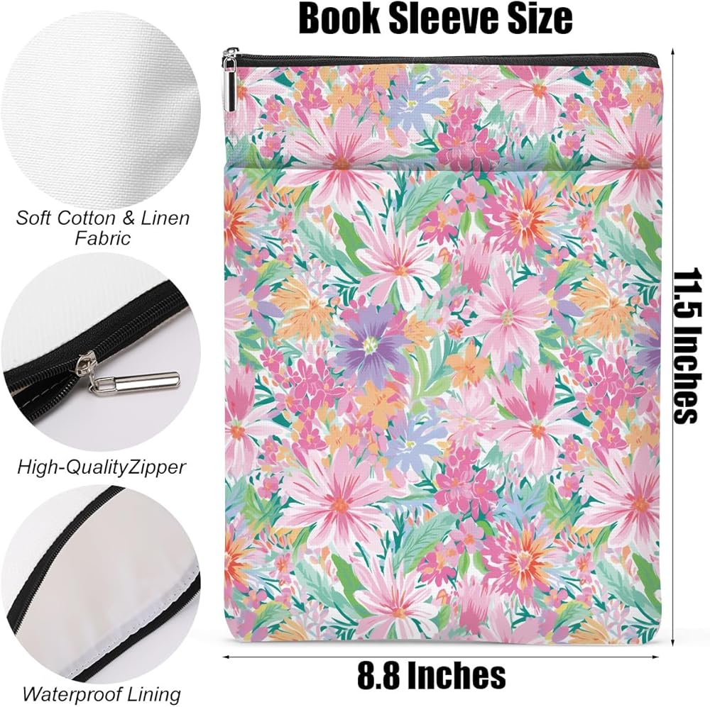 Size: Outside :9.8 x 8.5 inch; Inside: 11.8 x 8 inch.The compact size of this Book Sleeve makes it easy to slip into a tote bag or backpack, can protect book from damage.Front Pocket: The extra space can store electronics, kindle, office supplies or other small items.Fabric: Book Cover is made with durable, high-quality materials that are built to last, ensuring that you can use it for years to come.The simple and fashon design of the book pouch is sure to catch the eye, and keep a book organized and easy to find in a crowded bag or shelf.Zippered Closure: It has a sturdy zipper closure to prevent a book from falling out of a bag or backpack while on the go or getting scratched or scuffed while traveling. Keep your book clean and free of dirt, dust, and other contaminants and safe from moisture or water damage.