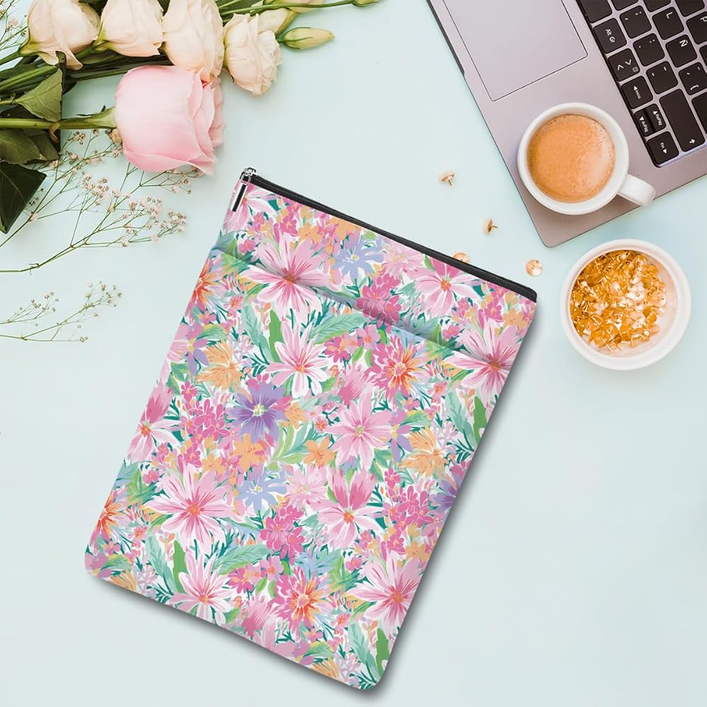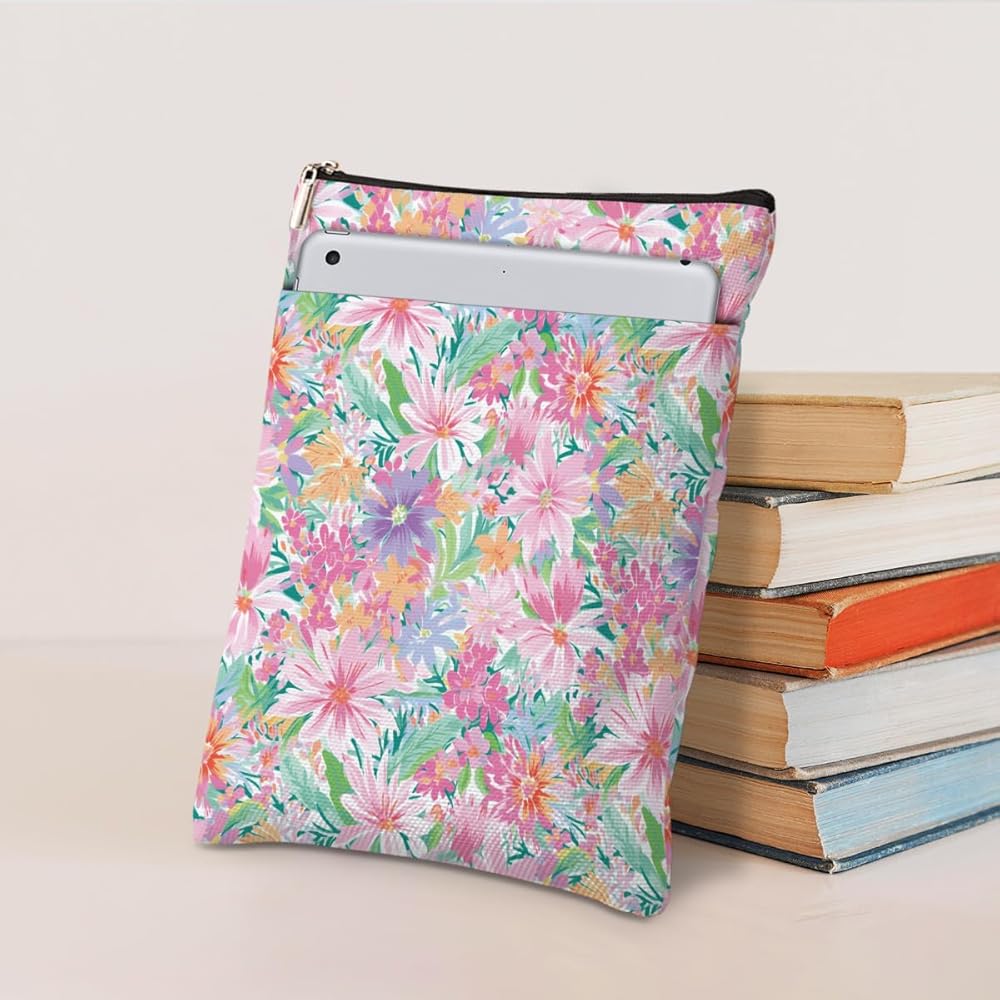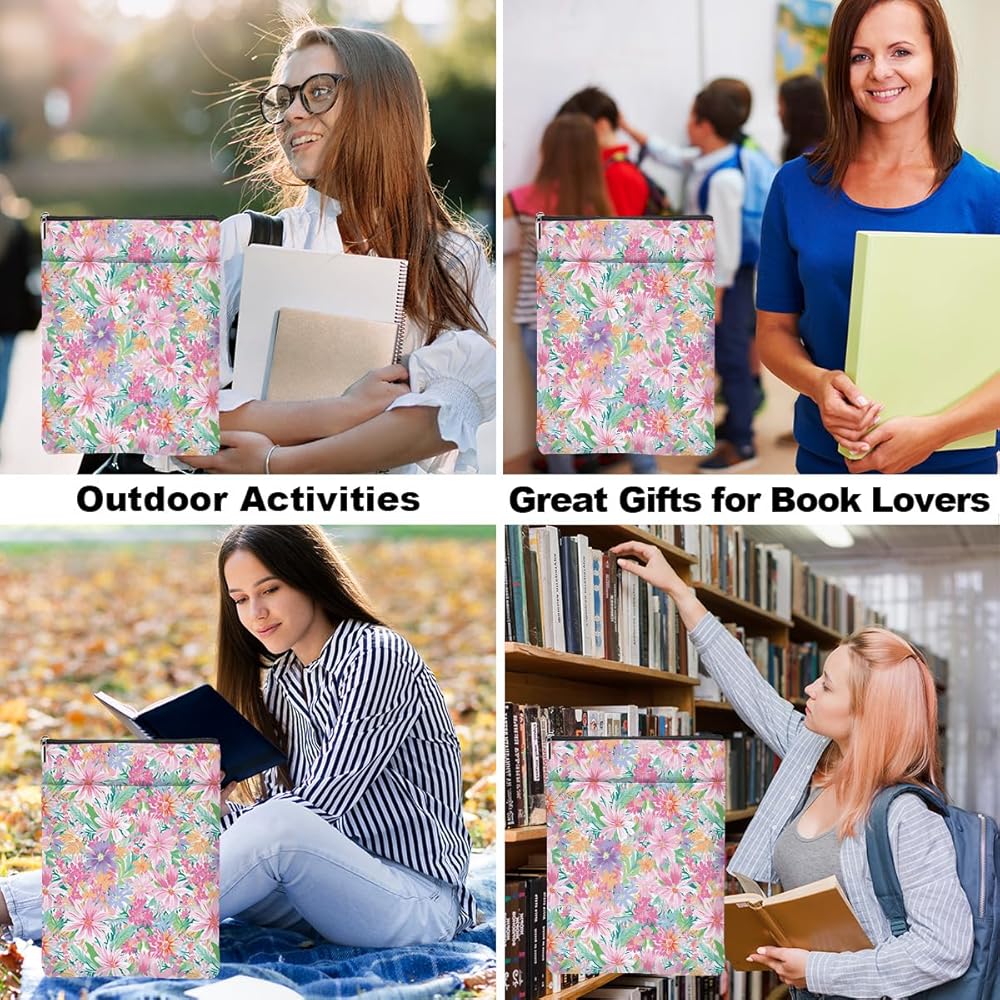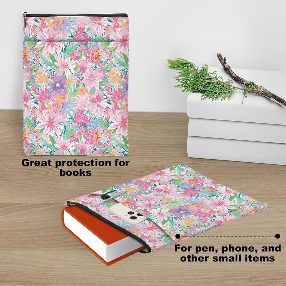 Smooth Zipper & Front Pocket: The book protector closes with a high-quality smooth zipper so the book won't slip out of the book sleeve accidentally. It has an additional front organizer pocket, and the size is about 9.5 x 8.5 inches offers a enough space for your accessories, notebook, as e-reader, small diaries, stationery, cosmetics, sunglasses, or other small decorative stuff. Great convenient for your daily use.