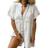 【Highlights】Lightweight and breathable cotton linen fabric perfect for hot days; front half button design for easily slip on or off; loose fit cotton linen rompers for a laid-back look; trendy shirt style shorts romper