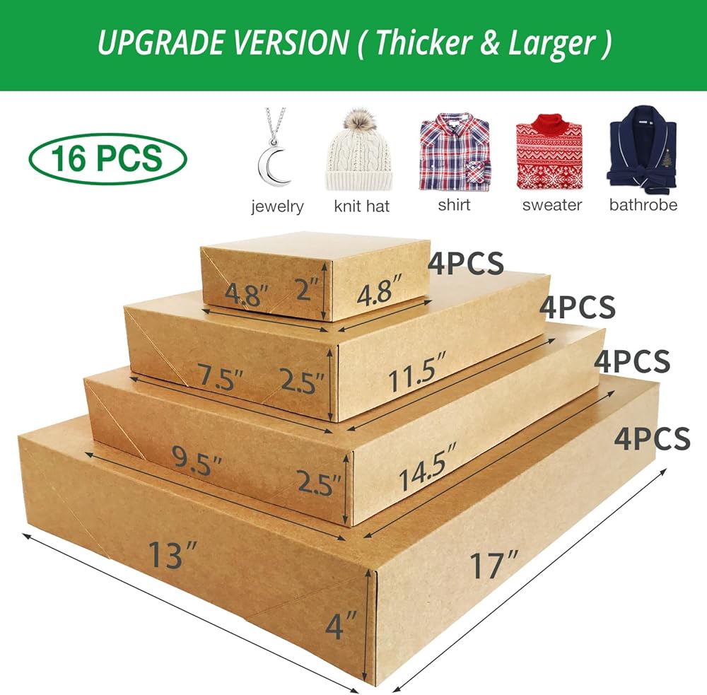 16 صندوق تغليف هدايا كرافت مع أغطية لتغليف الملابس الكبيرة جدًا و80 ملصقًا لبطاقات عيد الميلاد (أحجام متنوعة للقمصان والأردية والمعاطف والسترات والملابس وهدايا عيد الميلاد)