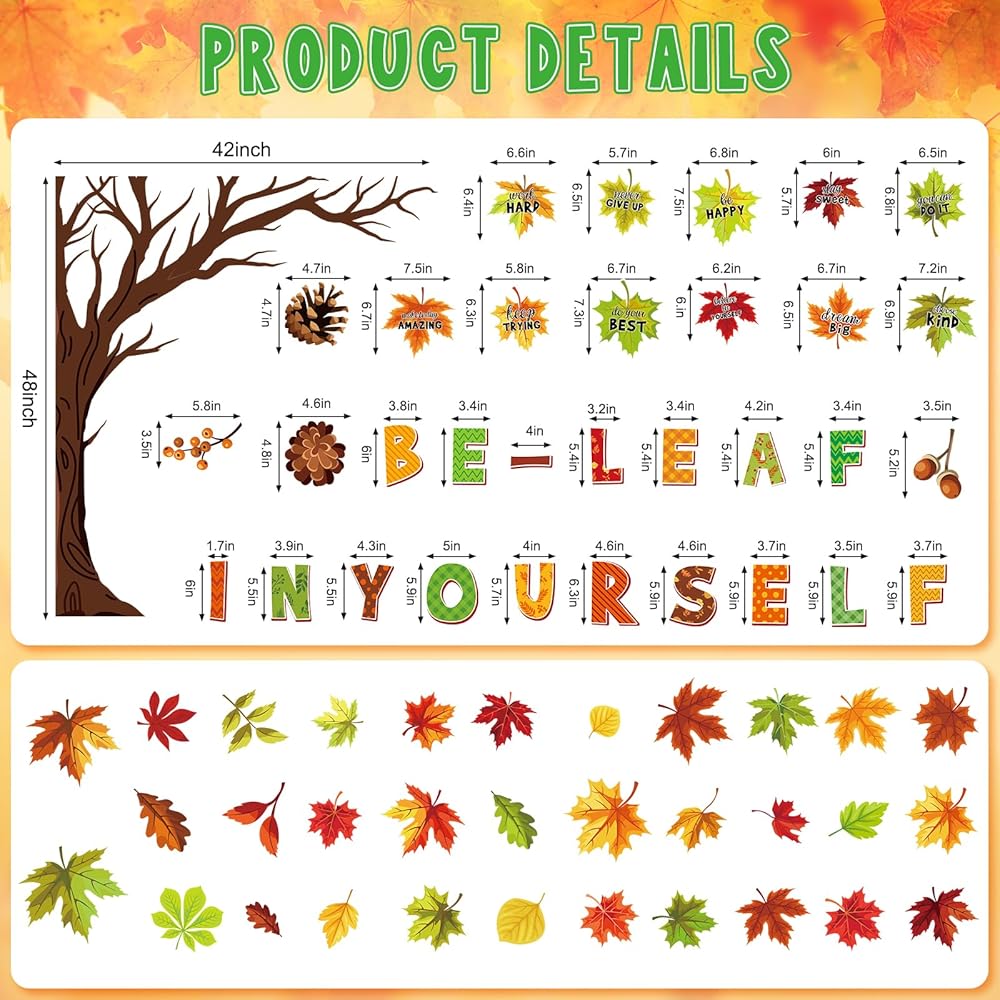 • Stylish Design:These fall inspirational paper cutouts are designed with fallen leaves,green leaves ,tree, pine cones elements and inspirational sayings Be-leaf in yourself, rich and lovely, echoing the theme of the classroom party. Different design styles can be provided for friends with different characteristics to meet your special needs.