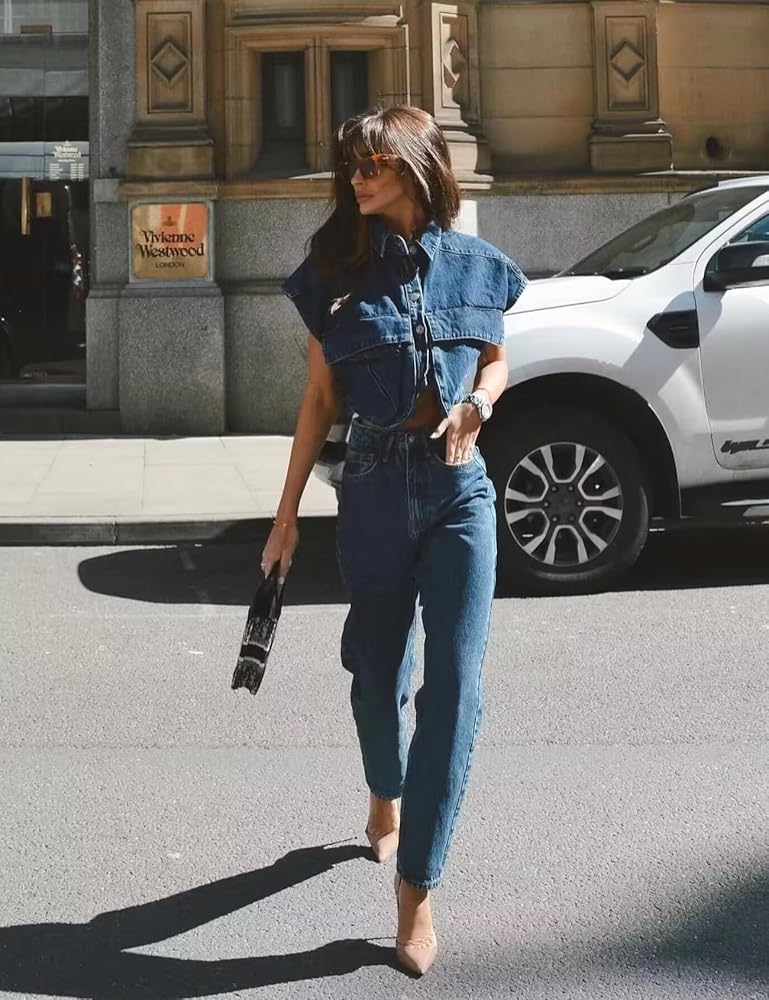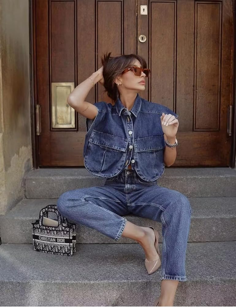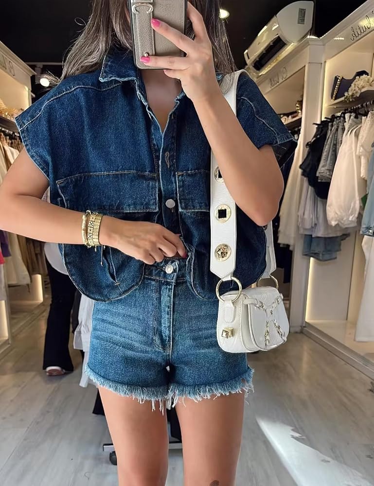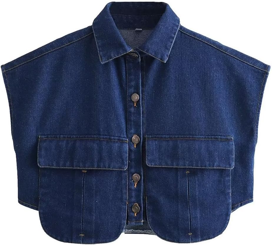 - التفاصيل: قميص جينز قصير للسيدات، بياقة مميزة، بدون أكمام، أزرار أمامية، حاشية غير متماثلة، جيبان أماميان.