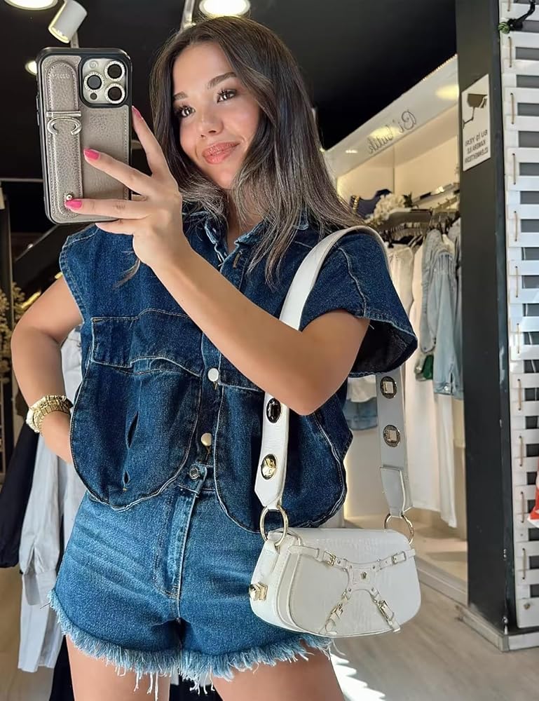 - بلوزة صيفية من الدنيم للسيدات. المقاس: S=US 4، M=US 6، L=US 8-10. الطول المقصوص، حوالي 16.15 بوصة/41 سم.