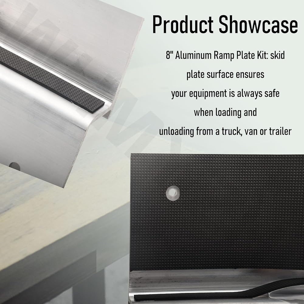 8" Aluminum Ramp Plate Kit: skid plate surface ensures your equipment is always safe when loading and unloading from a truck, van or trailer. Features a non-slip top surface for improved traction, and two rubberized protective pads included in the kit to protect your vehicle during use.