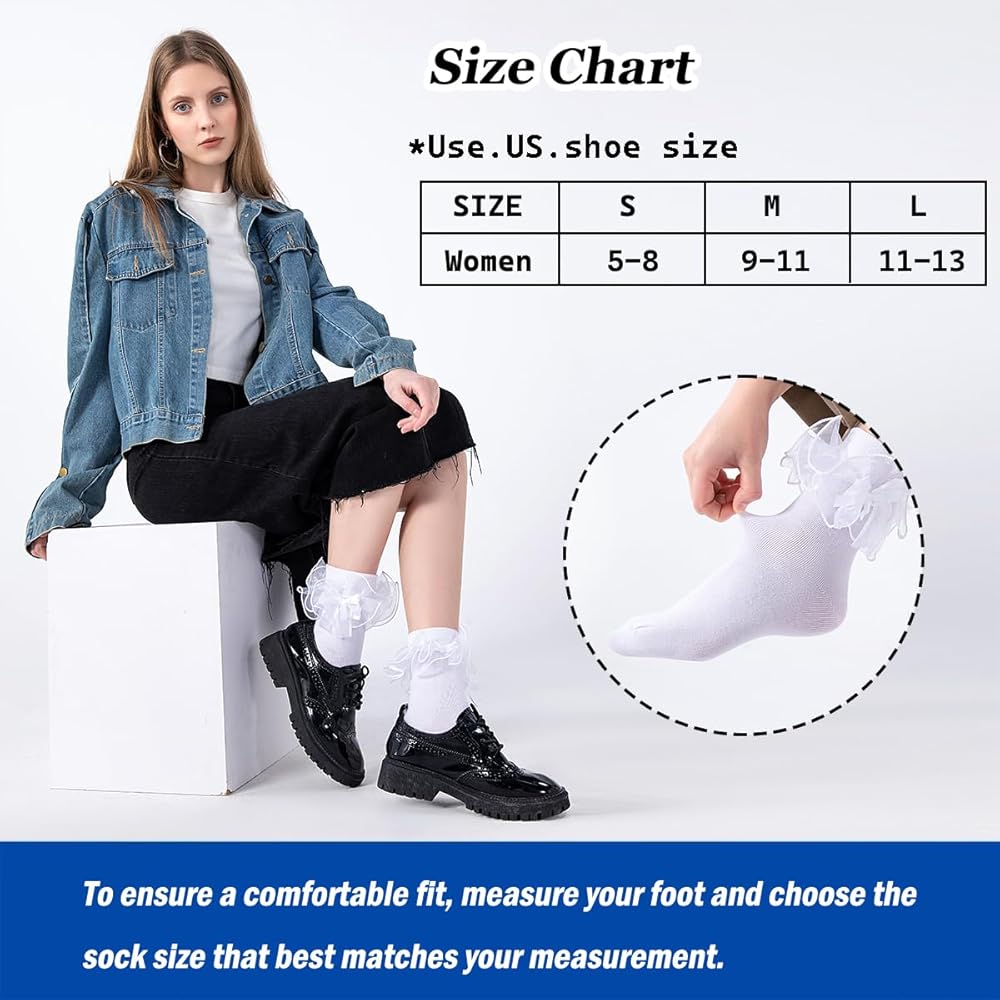 Comfortable and Stylish: These turn cuff socks feature frilly lace and hand-sewn bows, providing a comfortable fit without leaving marks on the ankles. The bows ensure they won't come off, adding a unique charm to these Lace Socks.
