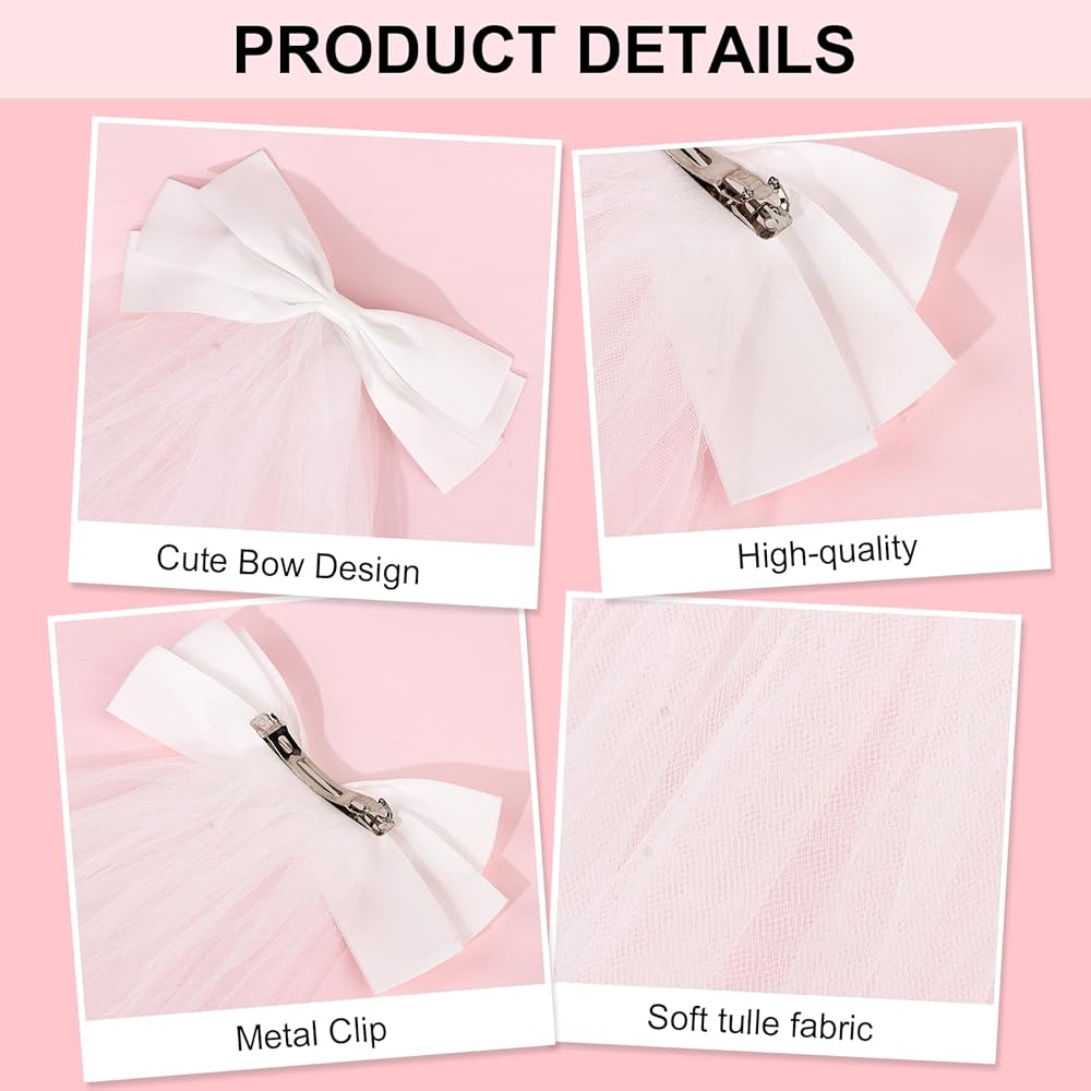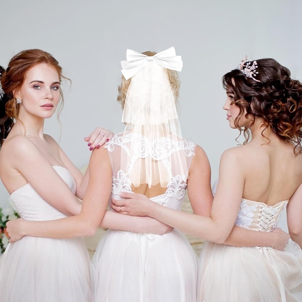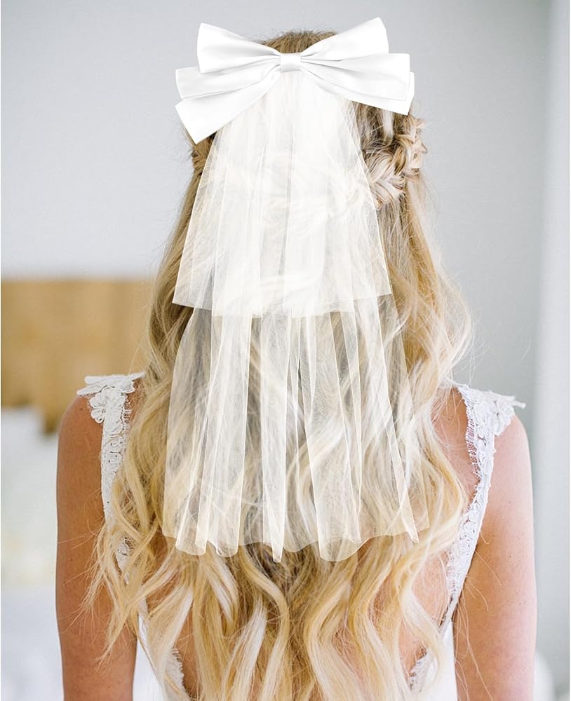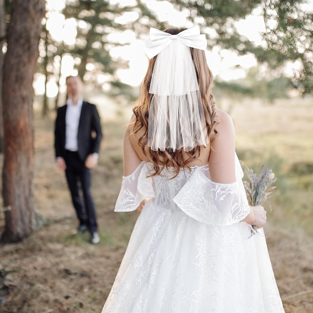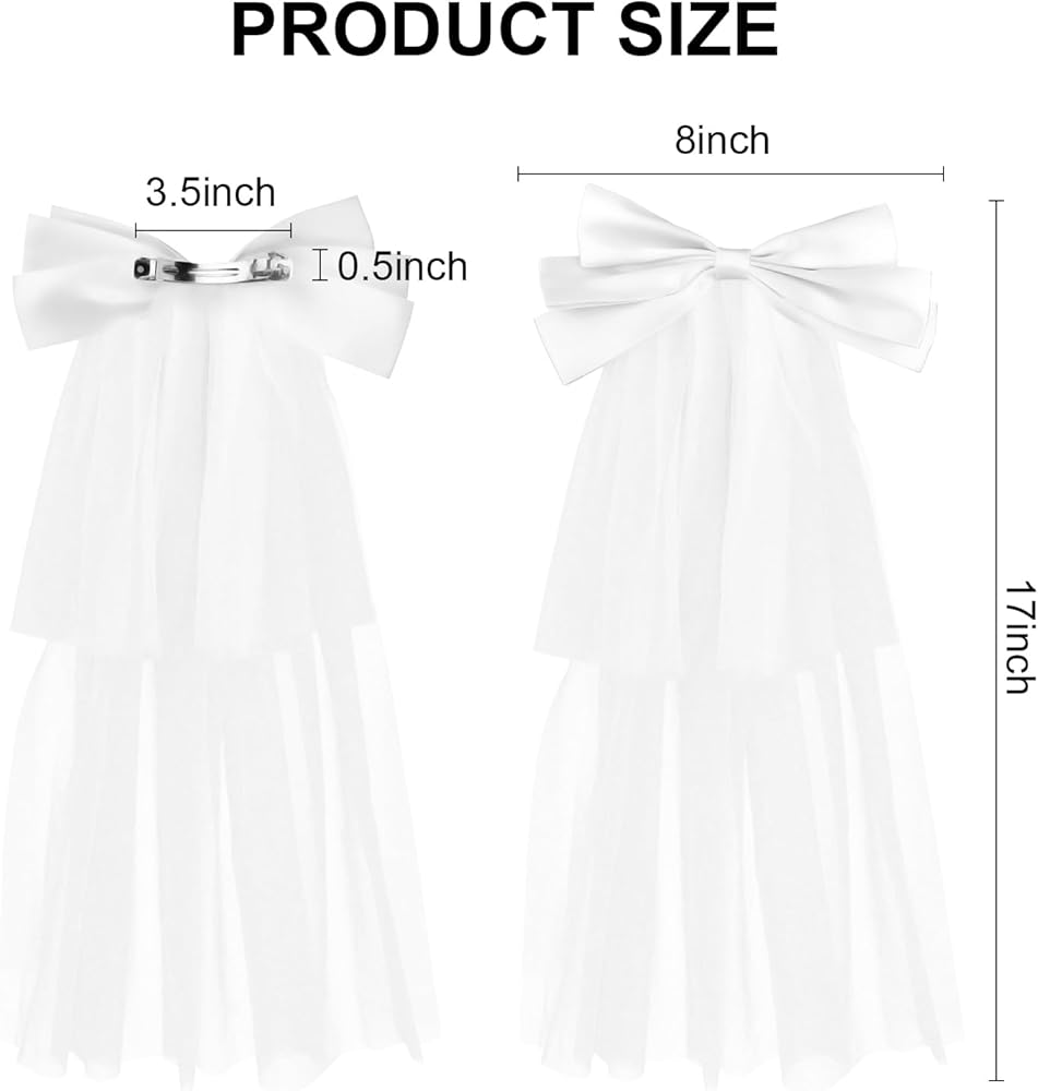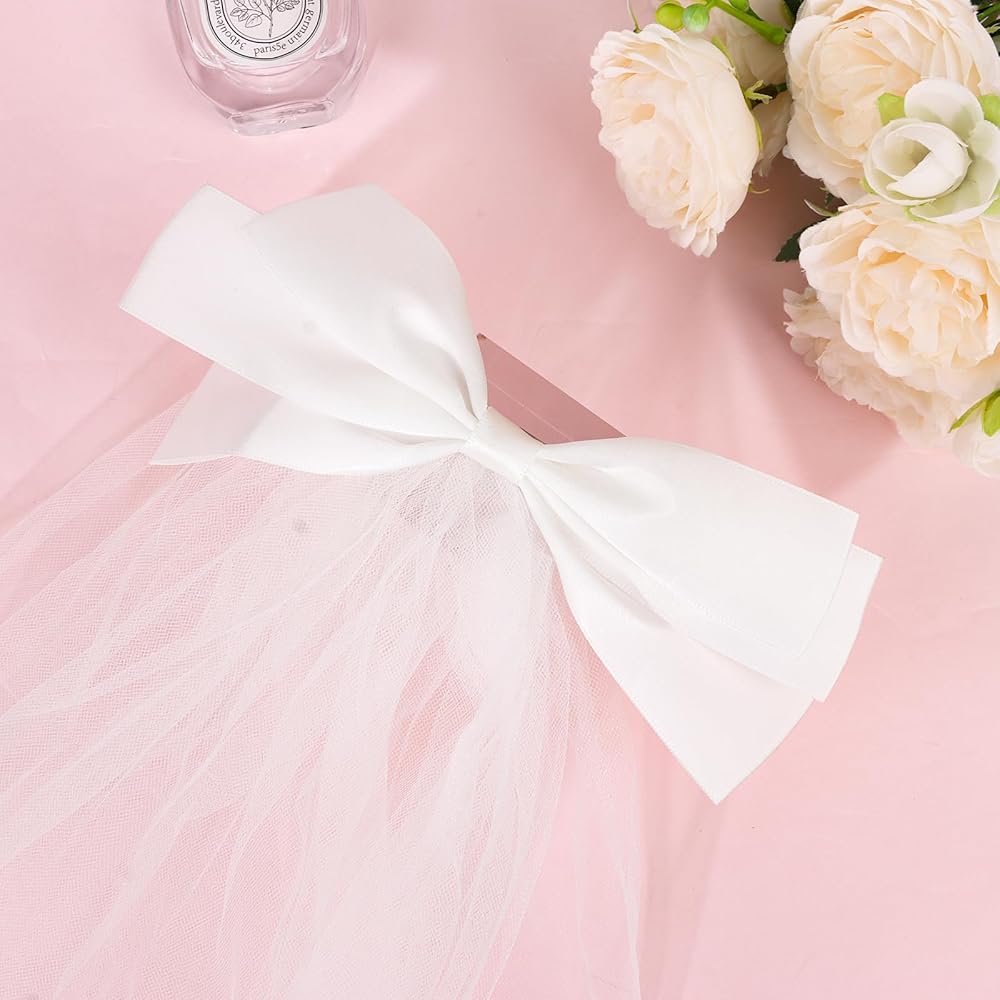 ناعم وخفيف: طرحة الزفاف ذات العقدة على شكل فيونكة مصنوعة من التول الأبيض ومشبك معدني وفيونكة شعر لطيفة. إنها ناعمة ومريحة، ولا تسقط بسهولة، وخفيفة الوزن وسهلة الارتداء، ومناسبة للاستخدام لفترة طويلة.